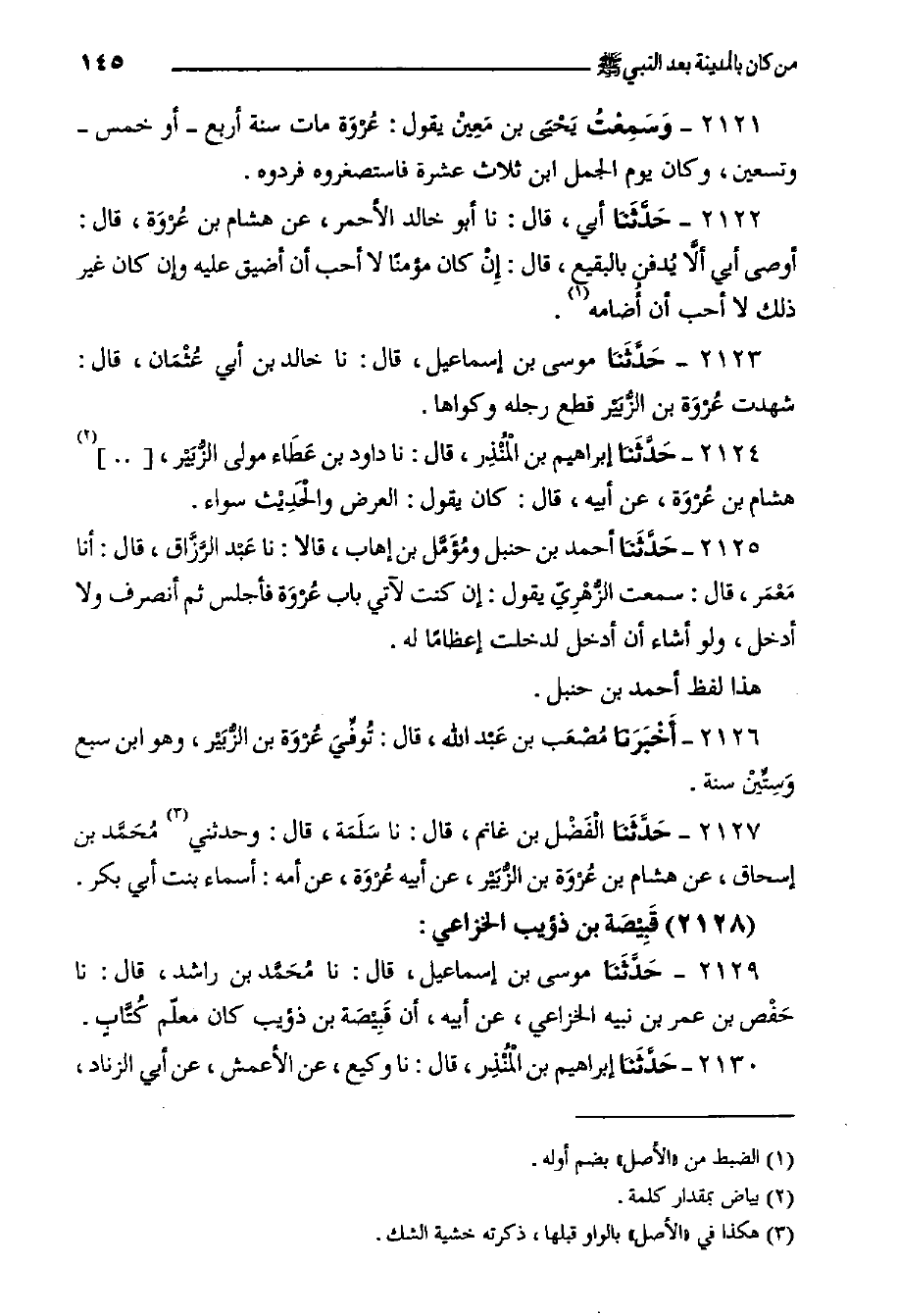 ٢١٢٦- أَخْبَرَنَا مُصْعَب بن عَبْد الله، قَالَ: تُوفِّيَ عُرْوَة بن الزُّبَيْر، وهو ابن سبع وَسِتِّيْن سنة.