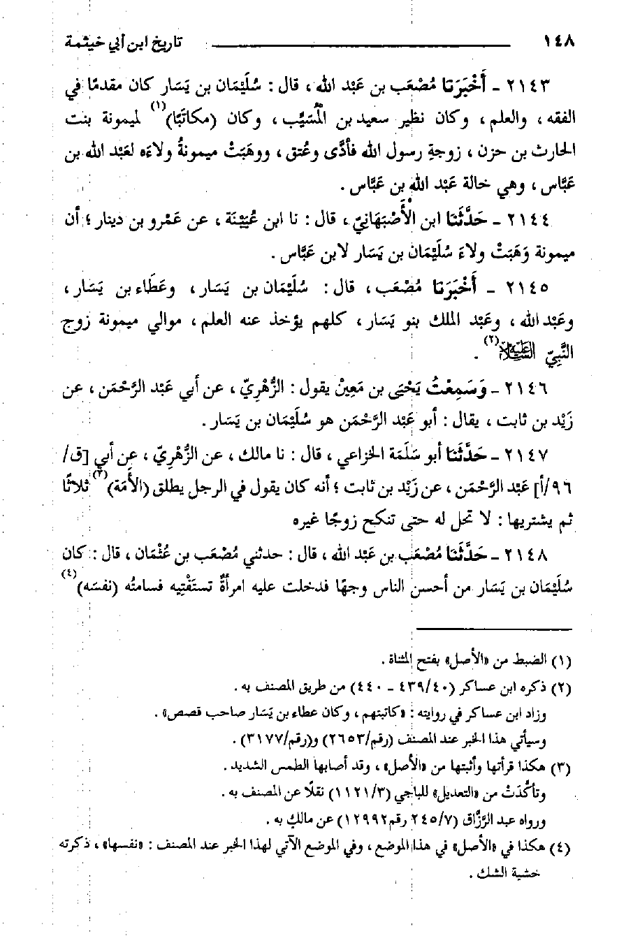 ٢١٤٨- حَدَّثَنا مُصْعَب بْنُ عَبْد اللَّهِ، قَالَ: حَدَّثَنِي مُصْعَب بن عُثْمَان، قَالَ: كان سُلَيْمَان بن يَسَار من أحسن الناس وجها فدخلت عَلَيْهِ امرأةٌ تستَفْتِيه فسامتُه نفسَه