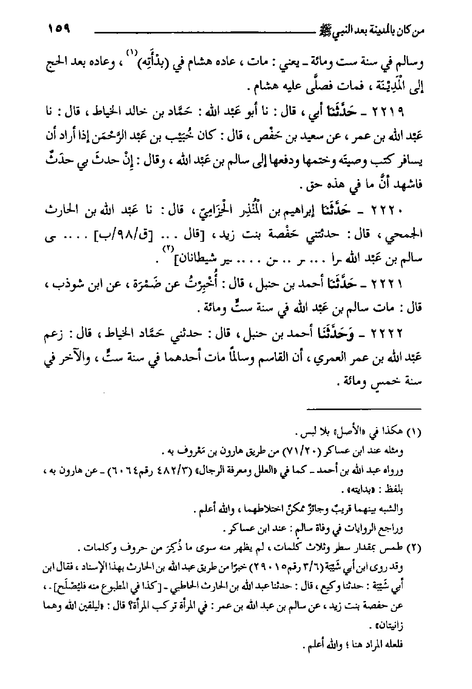 ٢٢٢٢- وَحَدَّثَنَا أَحْمَدُ بْنُ حَنْبَلٍ، قَالَ: حدثني حَمَّاد الخياط، قَالَ: زعم عَبْد الله بن عمر العمري، أن القاسم وسالما مات أحدهما في سنة ستٍّ، والآخر في سنة خمسٍ ومئة