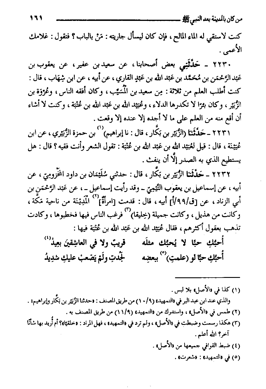 ٢٢٣٢- حَدَّثَنا الزُّبَيْر بْن بَكَّار، قَالَ: حَدَّثَنِي سُلَيْمَان بن داود المَخْزومِيّ، عن أبيه، عن إسماعيل بن يعقوب التَّيْمِيّ - وقد رأيت إسماعيل، عَنْ عَبْد الرَّحْمَن بْنِ أَبِي الزناد، عن [ق/٩٩/أ] أبيه، قَالَ: قدمت امرأةٌ الْمَدِيْنَة من ناحية مَكَّة، وكانت من هذيل، وكانت جميلة خِليقا فرغب الناس فيها فخطبوها، وكادت تذهب بعقول أكثرهم، فقال عُبَيْد الله بْن عَبْد اللَّه بْن عُتْبَة فيها: