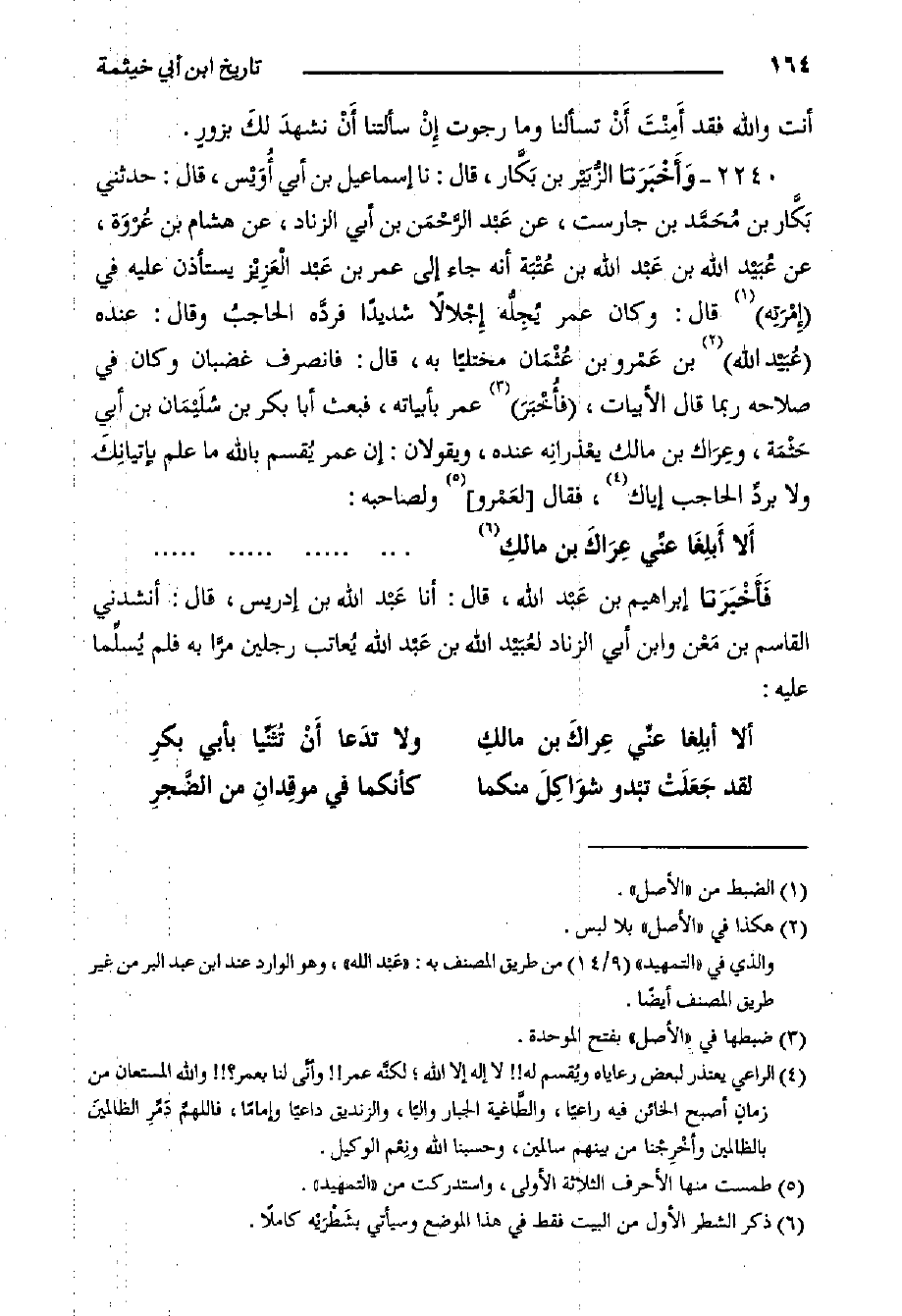 ٢٢٤٠- وَأَخْبَرَنَا الزُّبَيْر بن بَكَّار، قَالَ: حَدَّثَنَا إِسْمَاعِيل بْن أبي أُوَيْس، قَالَ: حدثني بَكَّار بن مُحَمَّد بن جارست، عن عَبْد الرَّحْمَن بن أبي الزناد، عن هشام بن عُرْوَة، عن عُبَيْد الله بن عَبْد الله بن عُتْبَة أنه جاء إِلَى عمر بن عَبْد الْعَزِيْز يستأذن عَلَيْهِ في إِمْرَتِه قَالَ: وكان عمر يُجِلُّه إِجْلالاً شديدا فردَّه الحاجبُ وقال: عنده عُبَيْد الله بن عَمْرو بن عُثْمَان مختليا به، قَالَ: فانصرف غضبان وكان في صلاحه ربما قَالَ الأبيات، فأُخْبَرَ عمر بأبياته، فبعث أبا بكر بن سُلَيْمَان بن أبي حَثْمَة، وعِرَاك بن مالك يعْذرانِه عنده، ويقولان: إن عمر يُقسم بالله ما علم بإتيانِكَ ولا بردِّ الحاجب إياك، فقال لعَمْرو (٥- ولصاحبه:
