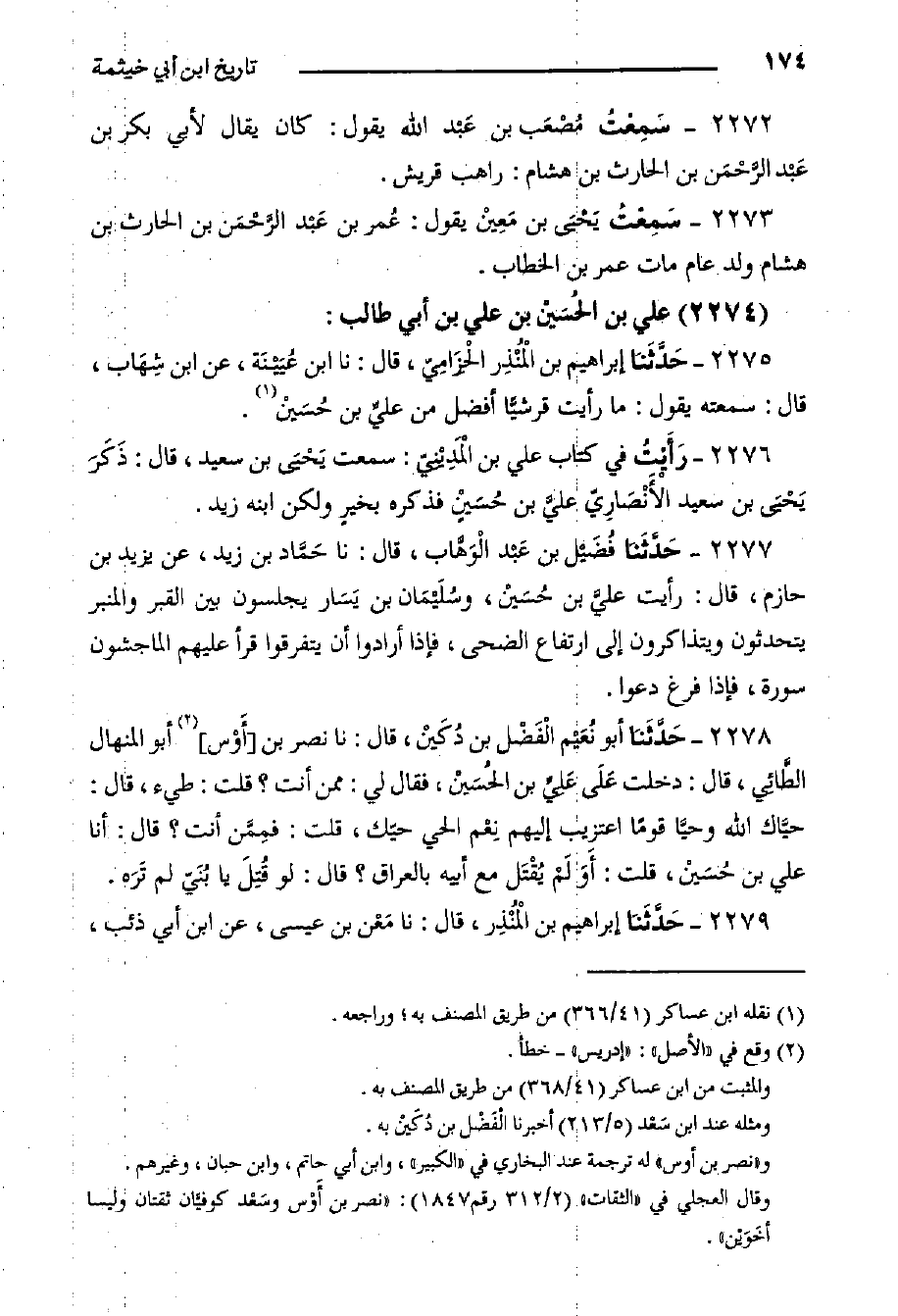 ٢٢٧٦- رَأَيْتُ في كتاب على بن الْمَدِيْنِيّ: سمعت يَحْيَى بن سعيد، قَالَ: ذَكَرَ يَحْيَى بن سعيد الأَنْصَارِيّ عليَّ بن حُسَيْنٍ فذكره بخيرٍ ولكن ابنه زيد.