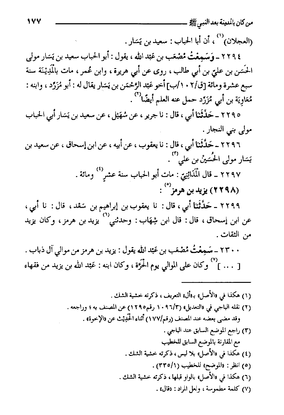 ٢٢٩٤- وَسَمِعْتُ مُصْعَب بن عَبْد الله، يقول: أبو الحباب سعيد بن يَسَار مولى الحَسَن بن علي بن أبي طالب، روى عن أبي هريرة، وابن عُمر، مات بالْمَدِيْنَة سنة سبع عشرة ومئة [ق/١٠٢/ب] أخو عَبْد الرَّحْمَن بن يَسَار يقال له: أبو مُزَرِّد، وابنه: مُعَاوِيَة بن أبي مُزَرِّد حمل عنه العلم أيضا.