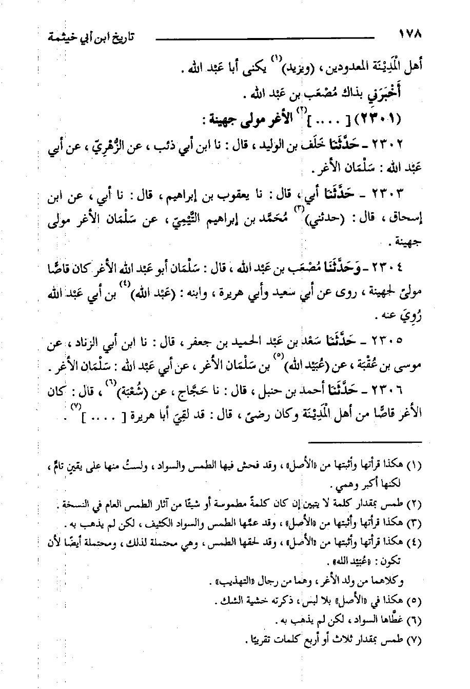 ٢٣٠٤- وَحَدَّثَنَا مُصْعَب بن عَبْد الله، قَالَ: سَلْمَان أبو عَبْد الله الأغر كان قاصا مولى لجهينة، روى عن أبي سعيد وأبي هريرة، وابنه: عَبْد الله بن أبي عَبْد الله رُوِيَ عنه.