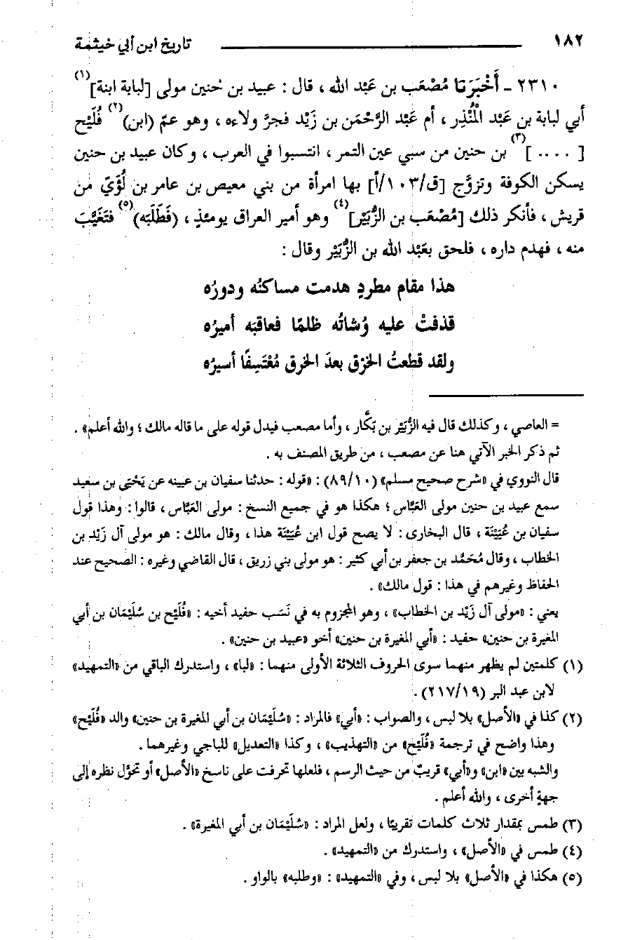 ٢٣١٠- أَخْبَرَنَا مُصْعَب بْن عَبْد اللَّه، قَالَ: عبيد بن حنين مولى لبابة ابنة أبي لبابة بن عَبْد الْمُنْذِر، أم عَبْد الرَّحْمَن بن زَيْد فجرَّ ولاءه، وهو عم ابن فُلَيْح ... بن حنين من سبي عين التمر، انتسبوا في العرب، وكان عبيد بن حنين يسكن الكوفة وتزوَّج [ق/١٠٣/أ] بها امرأة من بني معيص بن عامر بن لُؤَيّ من قريش، فأنكر ذلك مُصْعَب بن الزُّبَيْر- وهو أمير العراق يومئذٍ، فَطَلَبَه فتَغَيَّبَ منه، فهدم داره، فلحق بعَبْد الله بن الزُّبَيْر وقال: