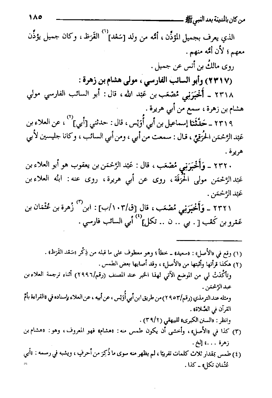 ٢٣١٨- أَخْبَرَنِي مُصْعَب بْن عَبْد اللَّه، قَالَ: أبو السائب الفارسي مولي هشام بن زهرة، سمع من أبي هريرة.
