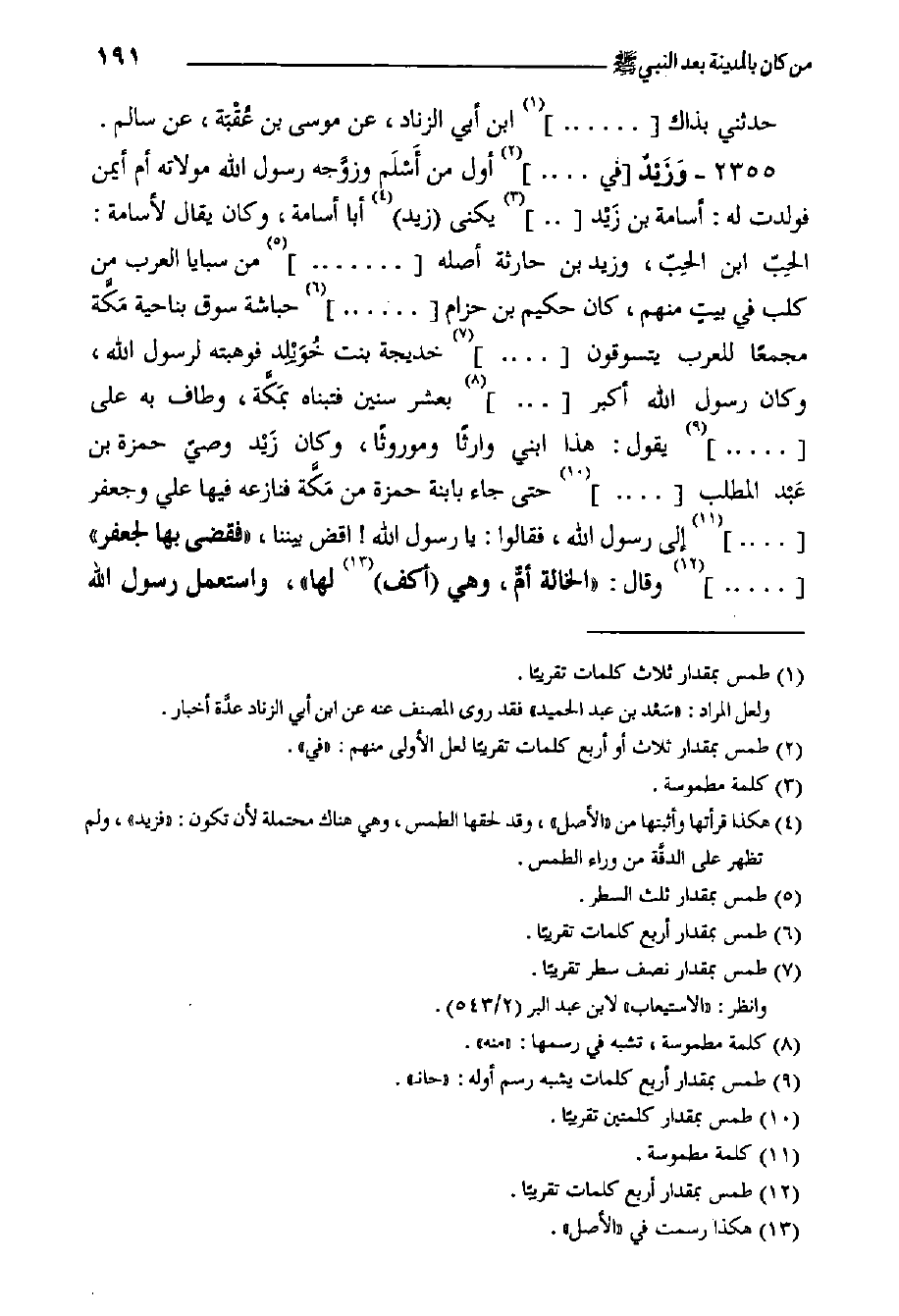 ٢٣٥٥- وَزَيْدٌ في ... أول من أَسْلَم وزوَّجه رَسُول اللَّهِ مولاته أم أيمن فولدت له: أسامة بن زَيْد.. يكنى زيد أبا أسامة، وكان يقال لأسامة: الحِبّ ابن الحِبّ، وزيد بن حارثة أصله ... . من سبايا العرب من كلب في بيتٍ منهم، كان حكيم بن حزام ... حباشة سوق بناحية مَكَّة مجمعا للعرب يتسوقون ... خديجة بنت خُوَيْلِد فوهبته لرسول الله، وكان رَسُول اللَّهِ أكبر ... بعشر سنين فتبناه بمَكَّة، وطاف به على ... يقول: هذا ابني وارثا وموروثا، وكان زَيْد وصي حمزة بن عَبْد المطلب ... حتى جاء بابنة حمزة من مَكَّة فنازعه فيها علي وجعفر ... إِلَى رَسُول الله، فقالوا: يا رَسُول اللَّهِ! اقض بيننا، "فقضى بها لجعفر" ... (١٢- وقال: الخالة أمٌّ، وهي (أكف لها"، واستعمل رسول الل