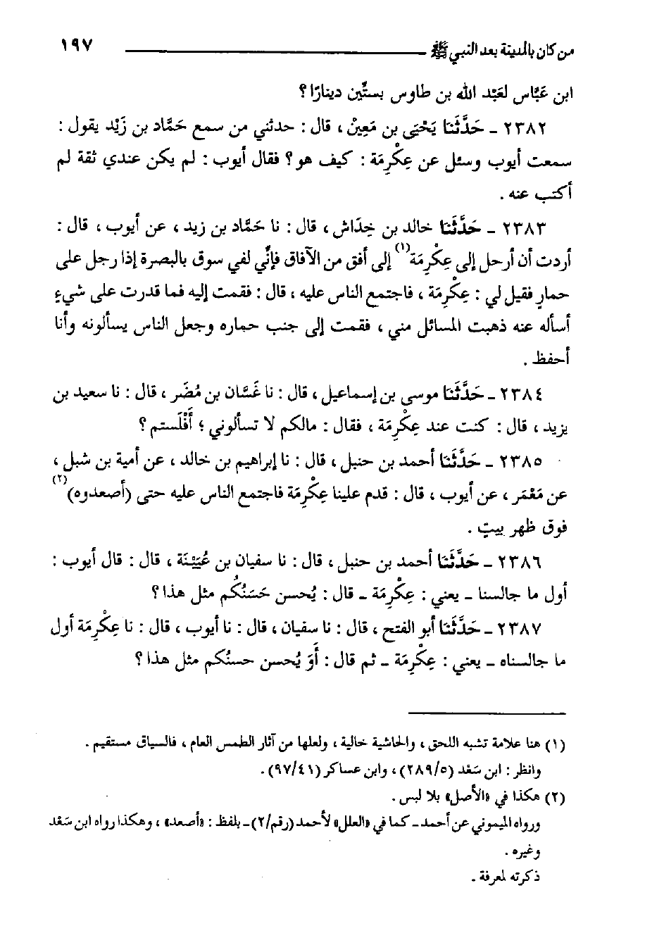 ٢٣٨٦- حَدَّثَنا أَحْمَدُ بن حنبل، قال: حدثنا سُفْيَان بْن عُيَيْنَة، قَالَ: قَالَ أيوب: أول ما جالسنا - يَعْنِي: عِكْرِمَة - قَالَ: يُحسن حَسَنُكُم مِثْلُ هَذَا؟ ٢٣٨٧- حَدَّثَنا أَبُو الْفَتْحِ، قال: حدثنا سفيان، قال: حدثنا أيوب، قال: حدثنا عِكْرِمَة أول ما جالسناه - يَعْنِي: عِكْرِمَة - ثُمَّ قَالَ: أَوَ يُحسن حسنُكم مِثْلُ هَذَا؟