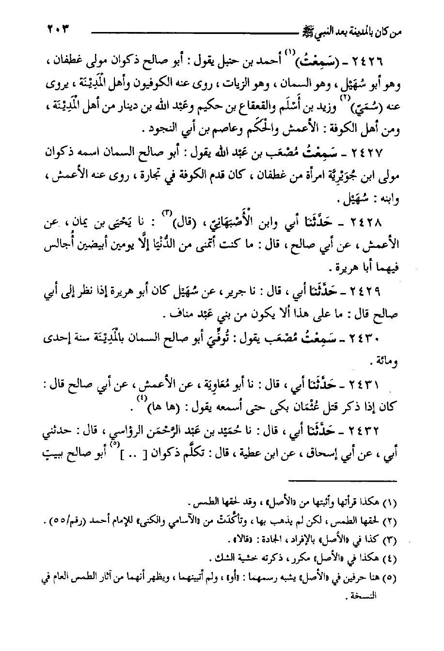 ٢٤٢٦- سَمِعْتُ أَحْمَد بْن حنبل يَقُولُ: أبو صالح ذكوان مولى غطفان، وهو أبو سُهَيْل، وهو السمان، وهو الزيات، روى عنه الكوفيون وأهل الْمَدِيْنَة، يروى عنه سُمَيّ (٢- وزيد بن أَسْلَم والقعقاع بن حكيم وعَبْد الله بن دينار من أهل الْمَدِيْنَة، ومن أهل الكوفة: الأعمش والْحَكَم وعاصم بن أبي النجود.