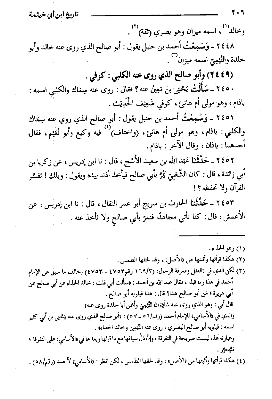 ٢٤٤٨- وَسَمِعْتُ أحمد بن حنبل يقول: أبو صالح الذي روى عنه خالد وأبو خلدة والتَّيْمِيّ اسمه ميزان.