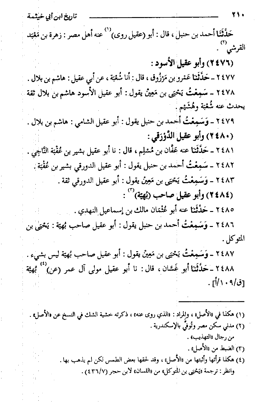 ٢٤٧٨- سَمِعْتُ يَحْيَى بن مَعِيْن يقول: أبو عقيل الأسود هاشم بن بلال ثقة يحدث عنه شُعْبَة وهُشَيْم.