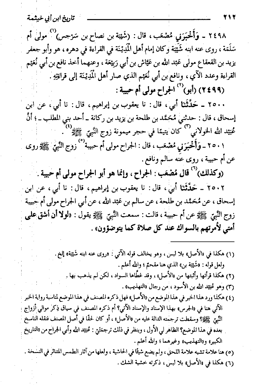 ٢٥٠٢- حَدَّثَنا أبي، قال: حدثنا يعقوب بن إبراهيم، قَالَ: حَدَّثَنَا أَبِي، عَنِ ابن إِسْحَاقَ، عَنْ مُحَمَّد ْبنِ طَلْحَةَ، عَنْ سَالِمِ بْنِ عَبْد اللَّهِ، عَنْ أَبِي الْجَرَّاحِ مَوْلَى أُمِّ حبيبة زوج النَّبِيّ صَلَّى اللَّهُ عَلَيْهِ وَسَلَّمَ عَنْ أُمِّ حَبِيبَةَ، قَالَتْ: سَمِعْتُ النَّبِيّ صَلَّى اللَّهُ عَلَيْهِ وَسَلَّمَ يَقُولُ: "لَوْلا أَنْ أَشُقَّ عَلَى أُمَّتِي لأَمَرْتُهُمْ بِالسِّوَاكِ عند كل صلاة كما يتوضؤون
