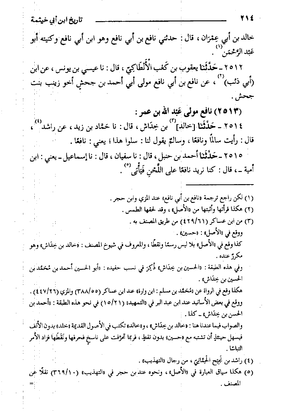٢٥١٤- حَدَّثَنا خَالِدُ بن خِدَاش، قال: حدثنا حَمَّاد بْنُ زَيْدٍ، عَنْ رَاشِدٍ، قَالَ: رَأَيْتُ سَالِمًا وَنَافِعًا، وسالمٌ يَقُولُ لَنَا: سَلُوا هَذَا؛ يَعْنِي: نَافِعًا.