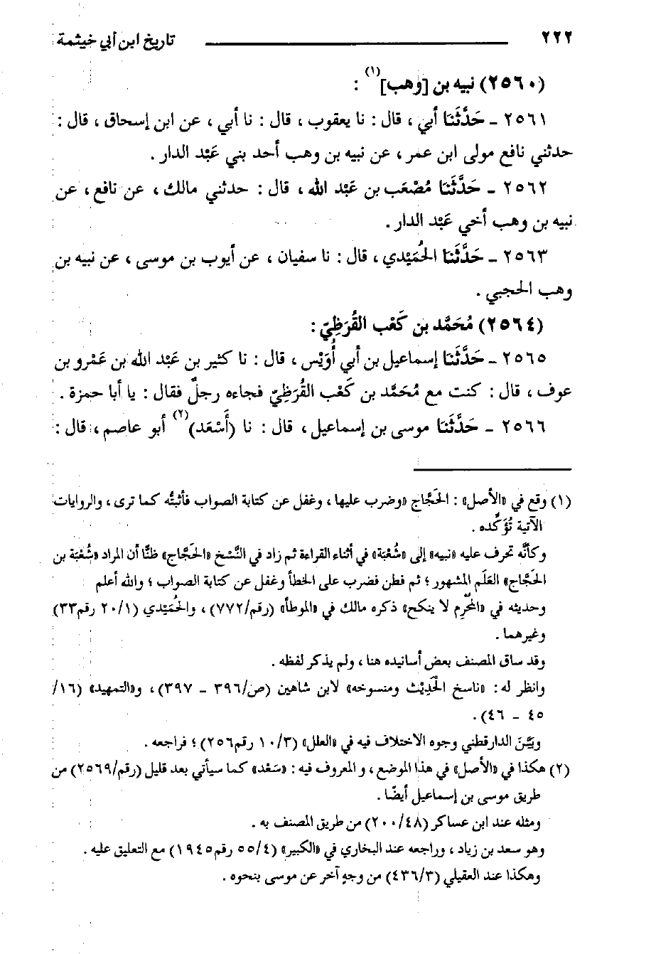 ٢٥٦٢- حَدَّثَنا مُصْعَب بن عَبْد الله، قَالَ: حدثني مالك، عن نافع، عن نبيه بن وهب أخي عَبْد الدار.