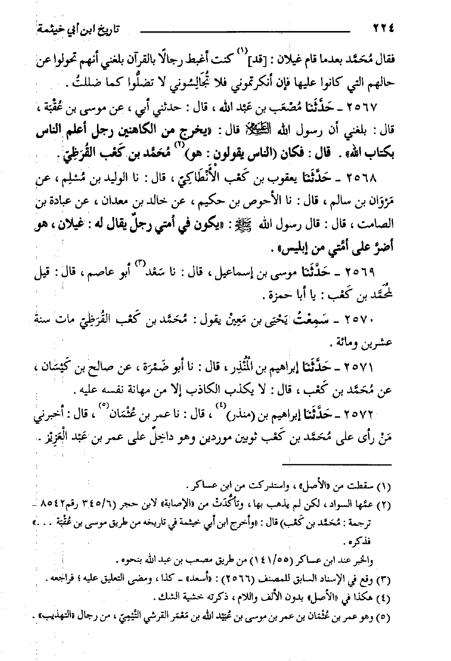 ٢٥٦٧- حَدَّثَنا مُصْعَب بْنُ عَبْد اللَّهِ، قَالَ: حَدَّثَنِي أَبِي، عَنْ مُوسَى بْنِ عُقْبَة، قَالَ: بَلَغَنِي أَنَّ رَسُولَ اللَّهِ عَلَيْهِ السَّلامُ قَالَ: يَخْرُجُ مِنَ الْكَاهِنَيْنِ رَجُلٌ أَعْلَمُ النَّاسِ بِكِتَابِ اللَّهِ. قَالَ: فَكَانَ النَّاسُ يَقُولُونَ: هُوَ مُحَمَّد بْنُ كَعْب القُرَظِيّ.