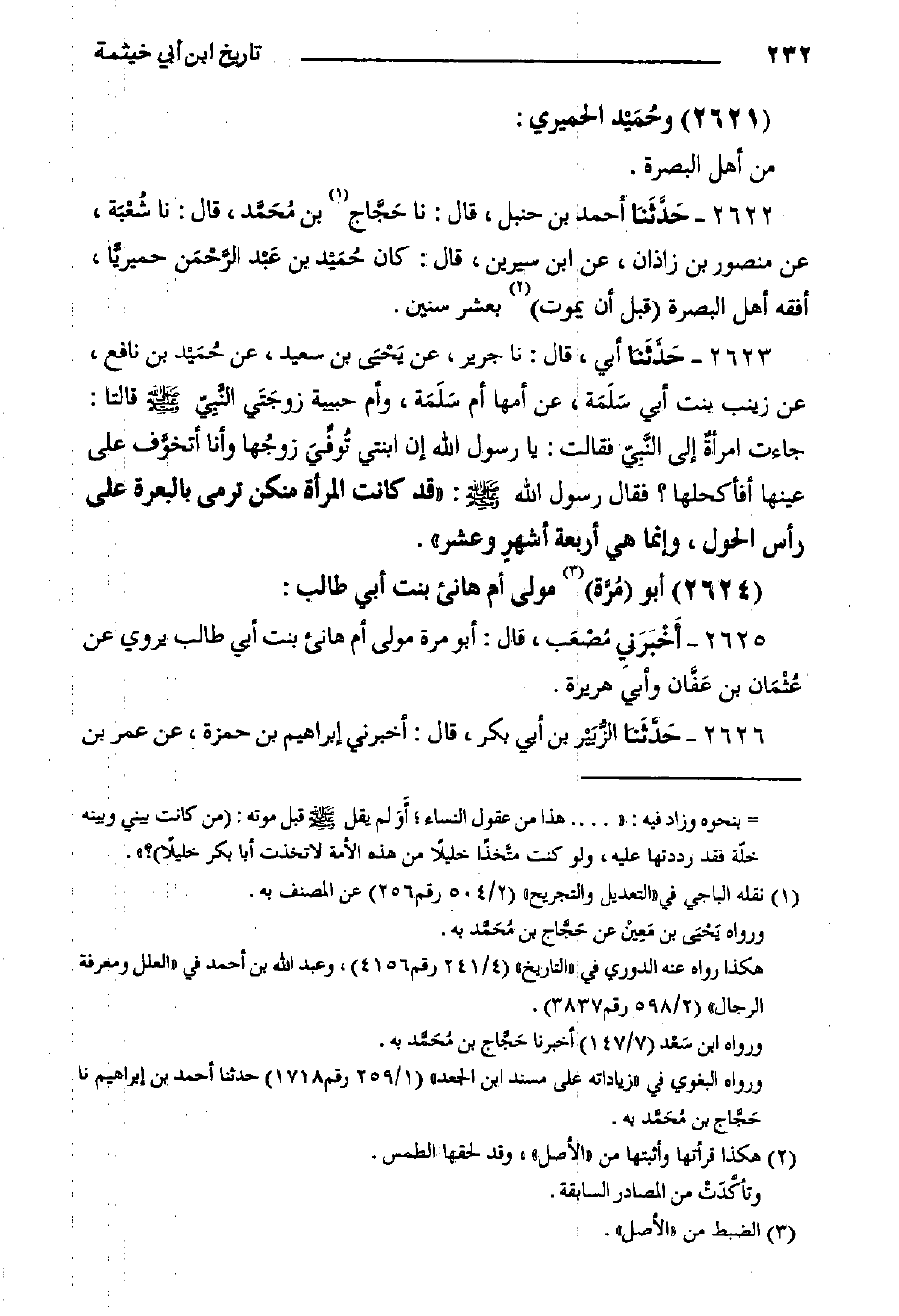 ٢٦٢٢- حَدَّثَنا أَحْمَد بْن حنبل، قَالَ: حدثنا حَجَّاج بن مُحَمَّد، قال: حدثنا شُعْبَة، عَنْ مَنْصُورِ بْنِ زَاذَانَ، عَنِ ابْنِ سِيرِينَ، قَالَ: كَانَ حُمَيْد بْنُ عَبْد الرَّحْمَن حِمْيَرِيًّا، أَفْقَهُ أَهْلِ الْبَصْرَةِ قَبْلَ أَنْ يَمُوتَ بِعَشْرِ سِنِينَ.