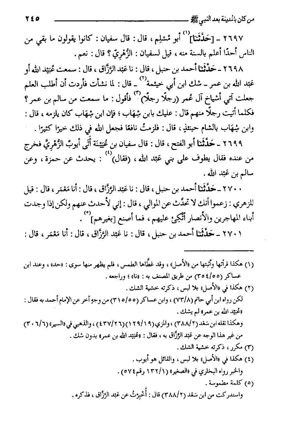 ٢٧٠٠- حَدَّثَنا أَحْمَد بْن حنبل، قَالَ: حدثنا عَبْد الرَّزَّاق، قال: أخبرنا مَعْمَر، قَالَ: قيل للزهري: زعموا أنك لا تحدِّث عن الموالي، قَالَ: إني لأحدث عنهم ولكن إذا وجدت أبناء المهاجرين والأنصار أتَّكِئ عليهم، فما أصنع بغيرهم.