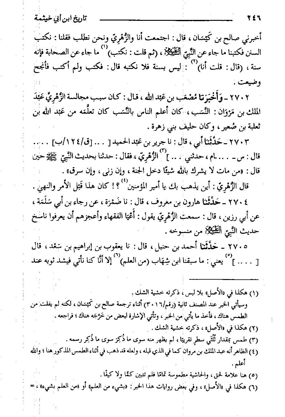 ٢٧٠٥- حَدَّثَنا أحمد بن حنبل، قال: حدثنا يَعْقُوبُ بْنُ إِبْرَاهِيمَ بْنِ سَعْد، قَالَ ... يعني: ما سبقنا ابن شِهَاب من العلم إلا أنَّا كنا نأتي فيشد ثوبه عن