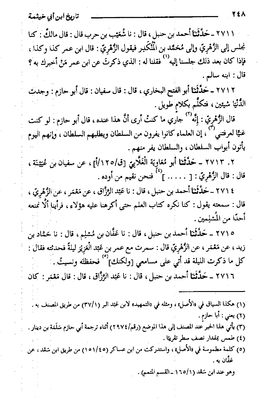 ٢٧١٤- حَدَّثَنا أحمد بن حنبل، قال: حَدَّثَنَا عَبْد الرَّزَّاق، عَنْ مَعْمَر، عن الزُّهْرِيّ، قَالَ: سمعته يقول: كنا نكره كتاب العلم حتى أكرهنا عَلَيْهِ هؤلاء، فرأينا ألَاّ نمنعه أحدا من المُسْلِمين.