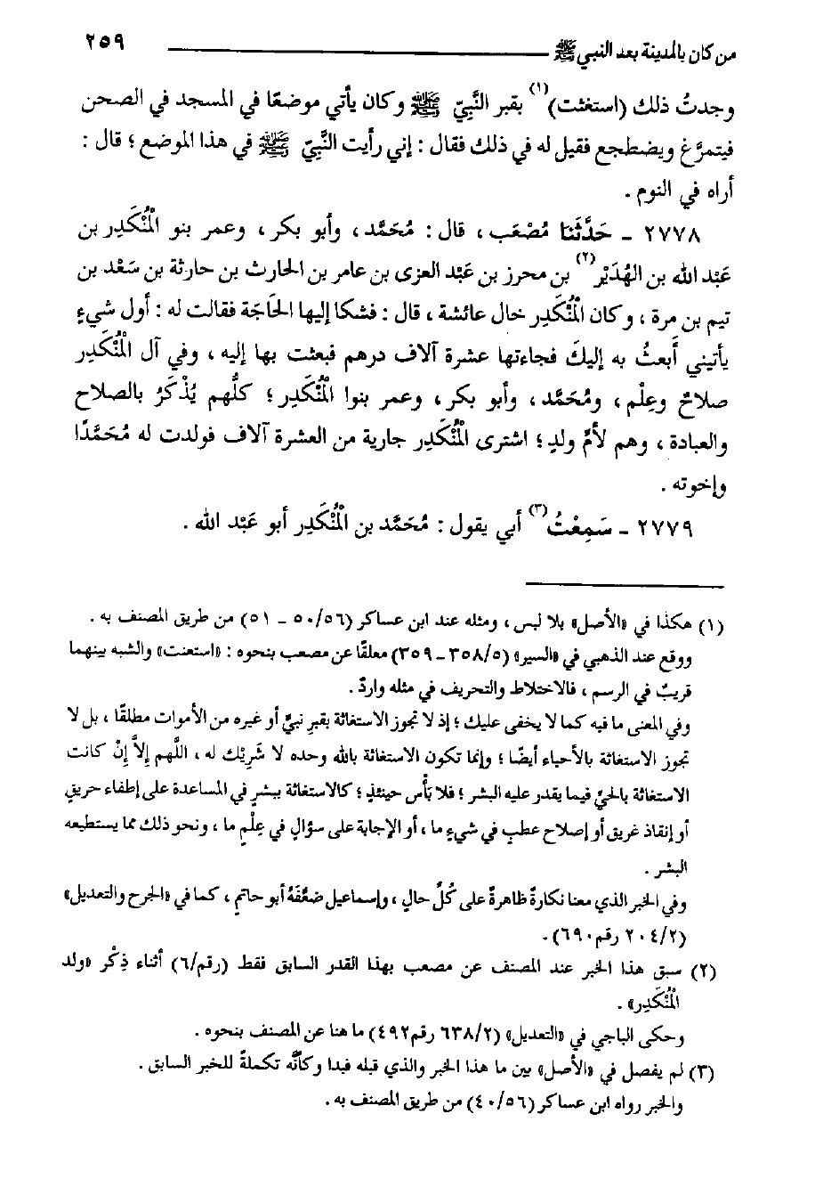 ٢٧٧٨- حَدَّثَنا مُصْعَب، قَالَ: مُحَمَّد، وأبو بكر، وعمر بنو الْمُنْكَدِر بن عَبْد الله بن الهُدَيْر بن محرز بن عَبْد العزي بن عامر بن الحارث بن حارثة بن سَعْد بن تيم بن مرة، وكان الْمُنْكَدِر خال عائشة، قَالَ: فشكا إليها الحَاجَة فقالت له: أول شيءٍ يأتيني أَبعثُ به إليكَ فجاءتها عشرة آلاف درهم فبعثت بها إليه، وفي آل الْمُنْكَدِر صلاحٌ وعِلْم، ومُحَمَّد، وأبو بكر، وعمر بنوا الْمُنْكَدِر؛ كلُّهم يُذْكَرُ بالصلاح والعبادة، وهم لأمِّ ولدٍ؛ اشترى الْمُنْكَدِر جارية من العشرة آلاف فولدت له مُحَمَّدًا وإخوته.