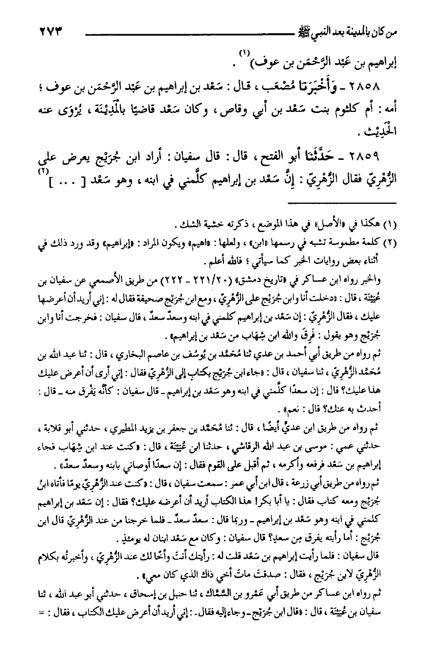 ٢٨٥٨- وَأَخْبَرَنَا مُصْعَب، قَالَ: سَعْد بْنِ إِبْرَاهِيمَ بْنِ عَبْد الرَّحْمَن بن عوف؛ أمه: أم كلثوم بنت سَعْد بن أبي وقاص، وكان سَعْد قاضيا بالْمَدِيْنَة، يُرْوَى عنه الْحَدِيْث.