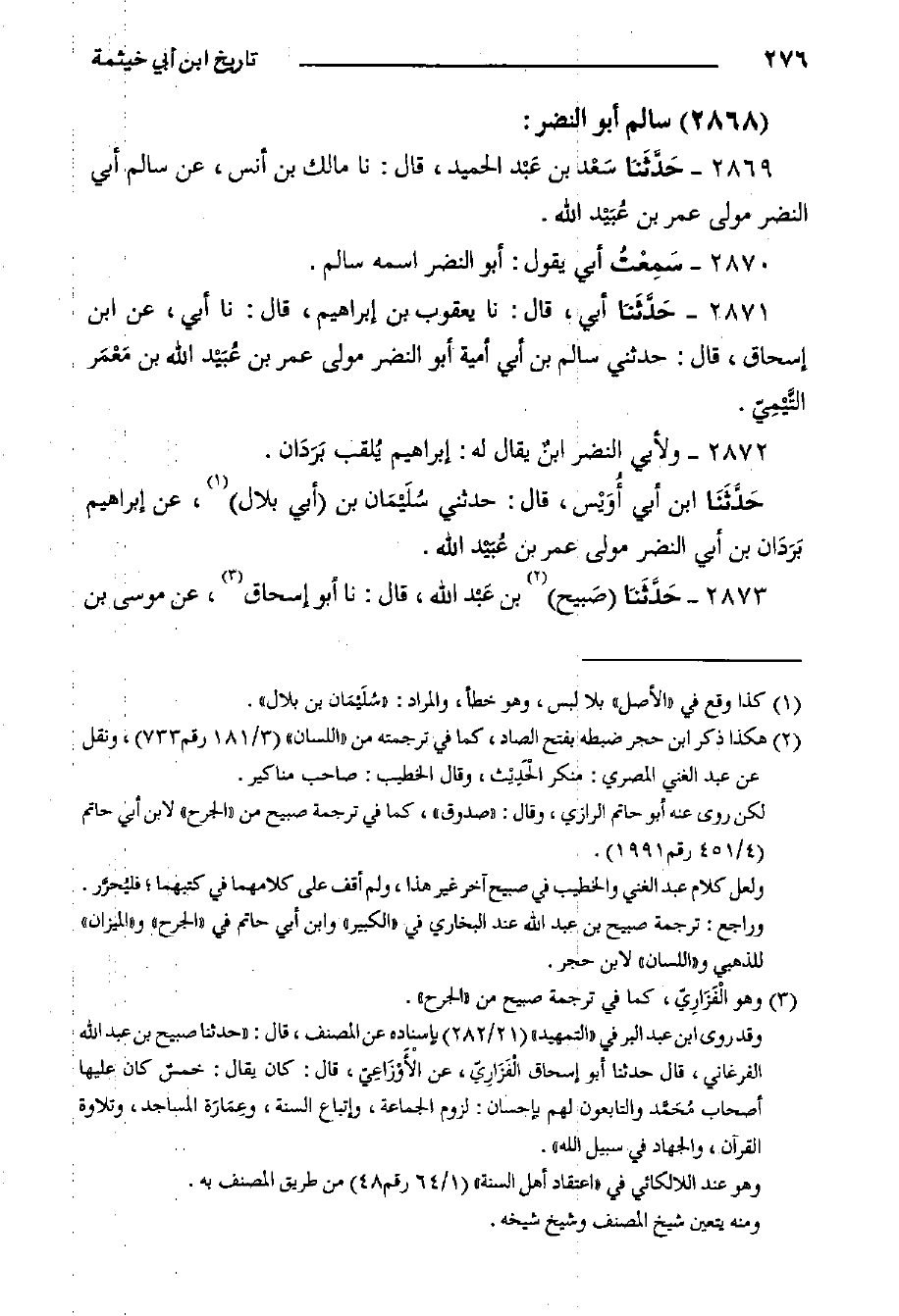 ٢٨٦٩- حَدَّثَنا سَعْد بن عَبْد الحميد، قال: حدثنا مالك بن أنس، عن سالم أبي النضر مولى عمر بن عُبَيْد الله.
