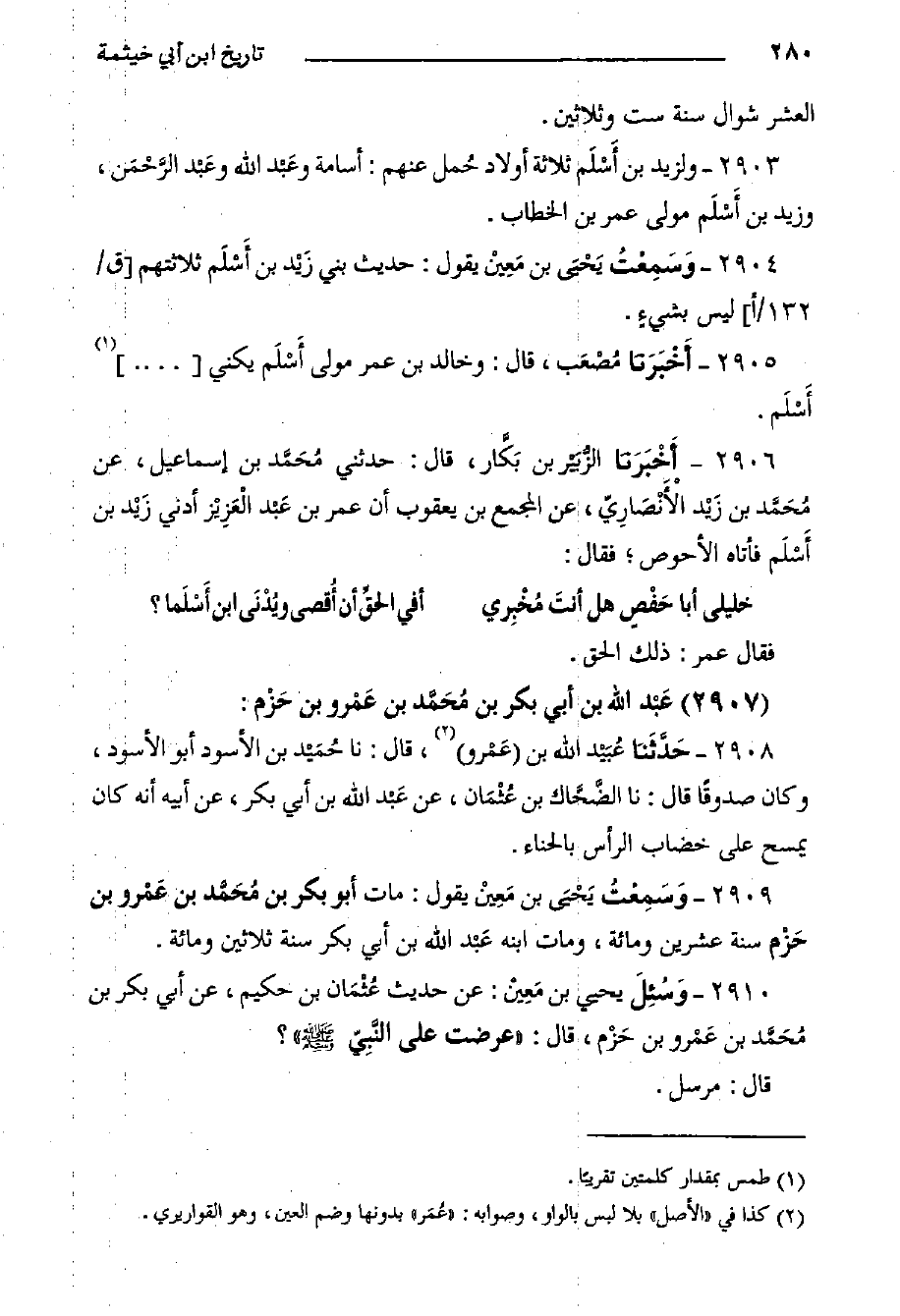 ٢٩٠٩- وَسَمِعْتُ يَحْيَى بن مَعِيْن يقول: مات أبو بَكْرِ بْنِ مُحَمَّد بْنِ عَمْرو بن حَزْم سنة عشرين ومئة، ومات ابنه عَبْد الله بن أبي بكر سنة ثلاثين ومئة.