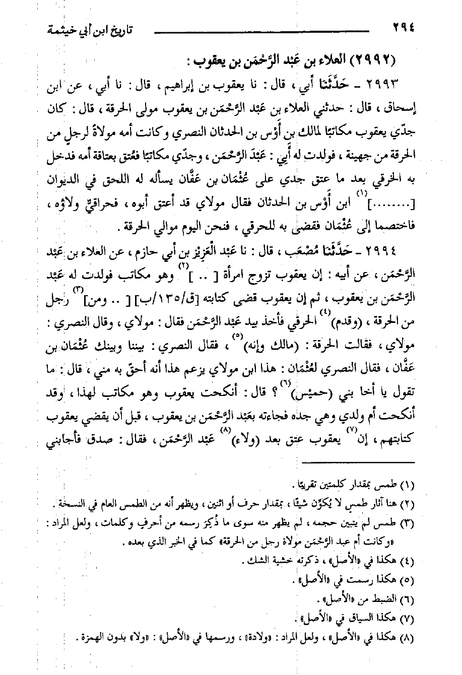 ٢٩٩٤- حَدَّثَنا مُصْعَب، قَالَ: حدثنا عَبْد الْعَزِيْز بْنُ أَبِي حَازِمٍ، عن العلاء بن عَبْد الرَّحْمَن، عن أبيه: إن يعقوب تزوج امرأة.. (٢- وهو مكاتب فولدت له عَبْد الرَّحْمَن بن يعقوب، ثم إن يعقوب قضى كتابته [ق/١٣٥/ب] .. ومن رجل من الحرقة، وقدم الحرقي فأخذ بيد عَبْد الرَّحْمَن فقال: مولاي، وقال النصري: مولاي، فقالت الحرقة: مالك وإنه، فقال النصري: بيننا وبينك عُثْمَان بن عَفَّان، فقال النصري لعُثْمَان: هذا ابن مولاي يزعم هذا أنه أحق به مني، قَالَ: ما تقول يا أخا بني حميْس؟ قَالَ: أنكحت يعقوب وهو مكاتب لهذا، وقد أنكحت أم ولدي وهي جدة فجاءته بعَبْد الرَّحْمَن بن يعقوب، قبل أن يقضي يعقوب كتابتهم، إن يعقوب عتق بعد ولاء عَبْد الرَّحْمَن، فقال: صدق فأجابن