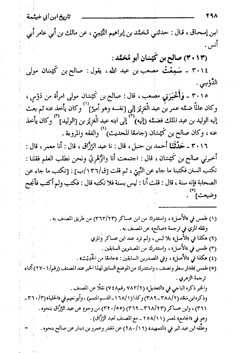 ٣٠١٦- حَدَّثَنَا أحمد بن حنبل، قال: حدثنا عبد الرَّزَّاق، قال: أخبرنا معمر، قَالَ: أخبرني صالح بن كَيْسَان، قَالَ: اجتمعت أنا والزُّهْرِيّ ونحن نطلب العلم فقلنا: نكتب السنن فكتبنا ما جاء عن النَّبِيّ، ثم قلت [ق/١٣٦/ب] : نكتب ما جاء عن الصحابة فإنه سنة، قَالَ: قلت أنا: ليس بسنة فلا نكتبه قَالَ: فكتب ولم أكتب فأنجح وضيعت