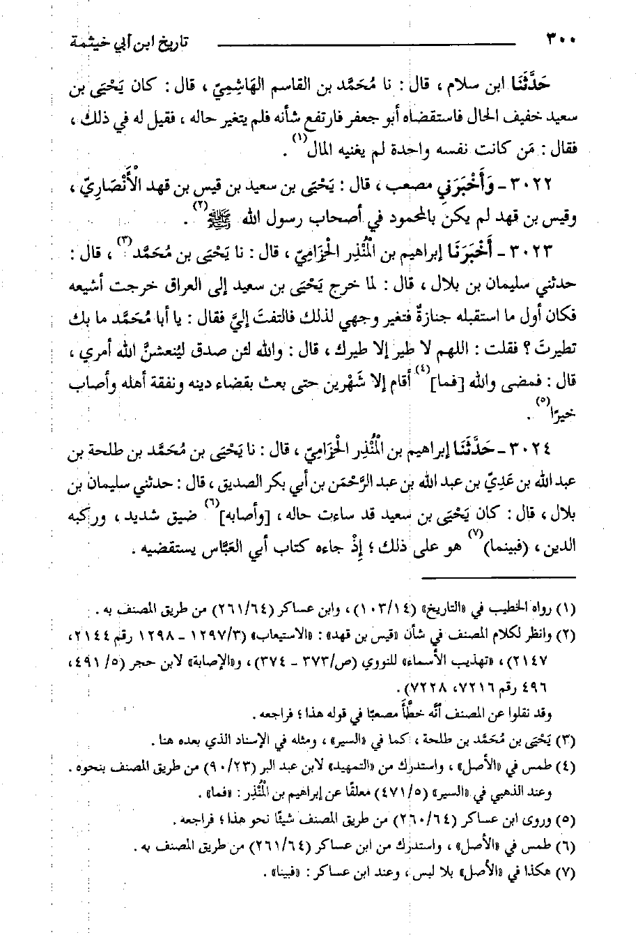 ٣٠٢٤- حَدَّثَنَا إبراهيم بن الْمُنْذِر الْحِزَامِيّ، قال: حدثنا يَحْيَى بن مُحَمَّد بن طلحة بن عبد الله بن عَدِيّ بن عبد الله بن عبد الرَّحْمَن بن أبي بكر الصديق، قَالَ: حدثني سليمان بن بلال، قَالَ: كان يَحْيَى بن سعيد قد ساءت حاله، وأصابه ضيق شديد، وركبه الدين، فبينما هو على ذلك؛ إِذْ جاءه كتاب أبي العَبَّاس يستقضيه