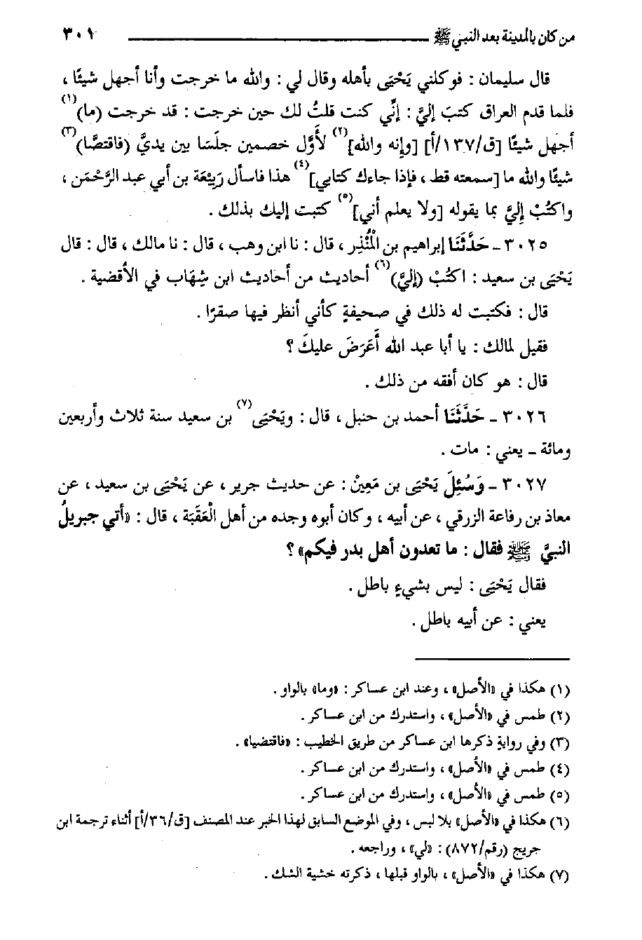٣٠٢٧- وَسُئِلَ يَحْيَى بن مَعِيْن: عَنْ حَدِيثِ جَرِيرٍ، عَنْ يَحْيَى بْنِ سَعِيدٍ، عَنْ مُعَاذِ بْنِ رِفَاعَةَ الزَّرْقِيِّ، عَنْ أَبِيهِ، وَكَانَ أَبُوهُ وَجَدُّهُ من أهل الْعَقَبَة، قَالَ: أَتَى جبريلُ النبيَّ صَلَّى اللَّهُ عَلَيْهِ وَسَلَّمَ فَقَالَ: مَا تَعُدُّونَ أَهْلَ بَدْرٍ فِيكُمْ"؟ فَقَالَ يَحْيَى: لَيْسَ بشيءٍ بَاطِلٍ.