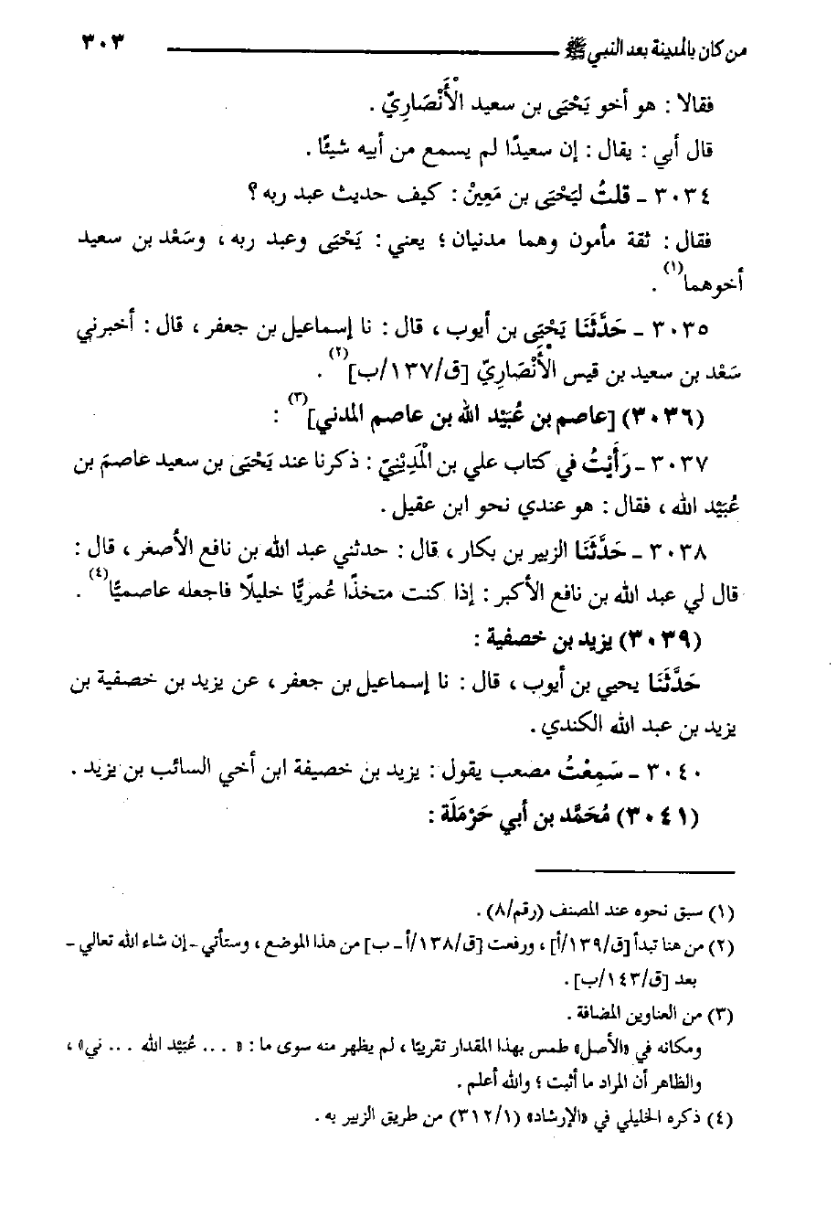 ٣٠٣٤- قلتُ ليَحْيَى بن مَعِيْن: كيف حديث عبد ربه؟ فقال: ثقة مأمون وهما مدنيان؛ يعني: يَحْيَى وعبد ربه، وسَعْد بن سعيد أخوهما.