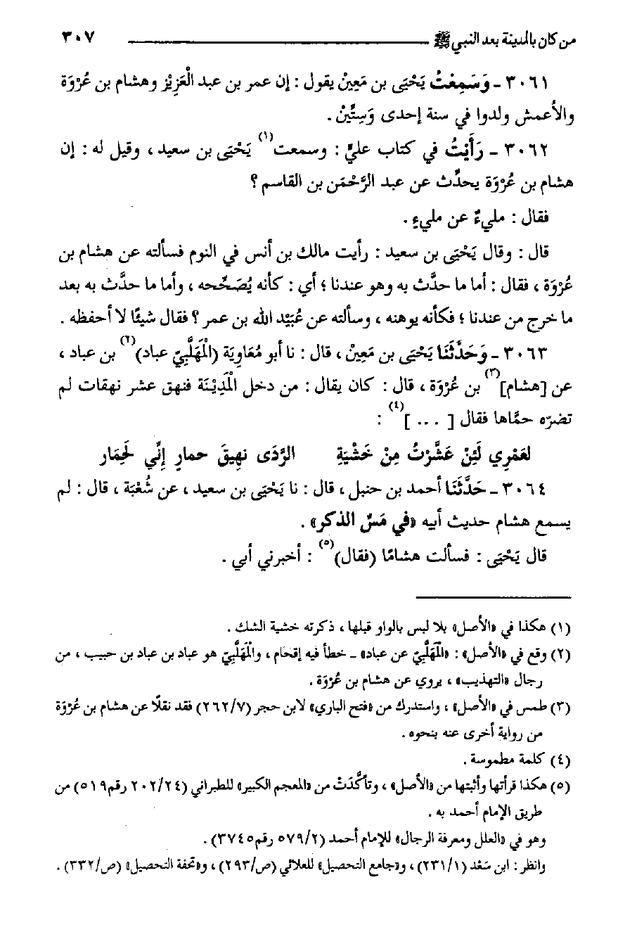 ٣٠٦٣- وَحَدَّثَنَا يَحْيَى بن مَعِيْن، قال: حدثنا أبو مُعَاوِيَة الْمَهَلَّبِيّ عباد بن عَبَّادٍ، عَنْ هِشَامِ بْنِ عُرْوَة، قَالَ: كان يقال: من دخل الْمَدِيْنَة فنهق عشر نهقات لم تضره حمَّاها فقال ... :