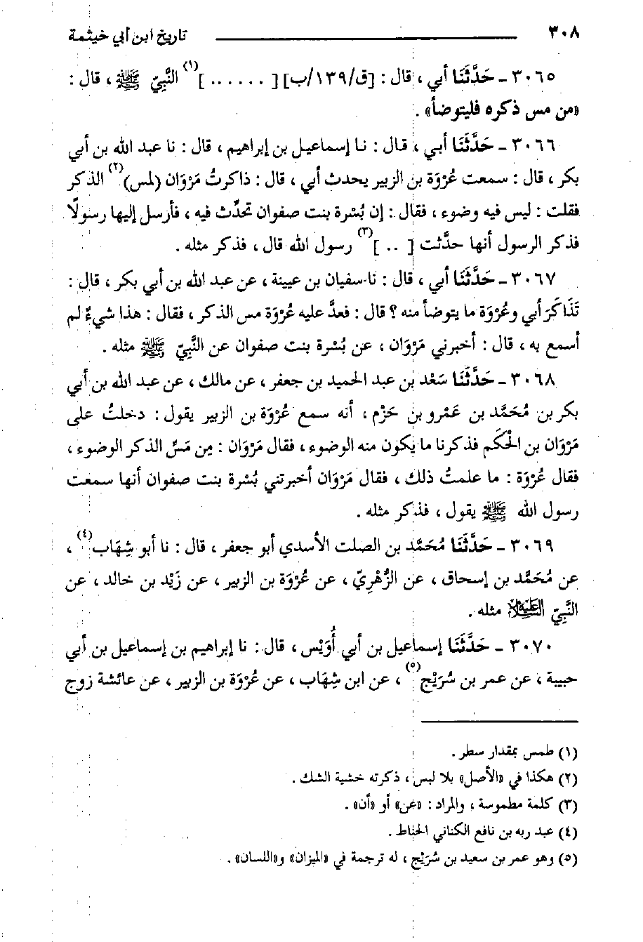 ٣٠٦٨- حَدَّثَنَا سَعْد بن عبد الحميد بن جعفر، عن مالك، عن عبد اللَّه بْن أبي بكر بْن مُحَمَّد بن عَمْرو بن حَزْم، أنه سمع عُرْوَة بن الزبير يقول: دخلتُ على مَرْوَان بن الْحَكَم فذكرنا ما يكون منه الوضوء، فقال مَرْوَان: مِن مَسِّ الذكر الوضوء، فقال عُرْوَة: ما علمتُ ذلك، فقال مَرْوَان أخبرتني بُسْرة بنت صفوان أنها سمعت رَسُول اللَّهِ صَلَّى اللَّهُ عَلَيْهِ وَسَلَّمَ يقول، فذكر مثله.