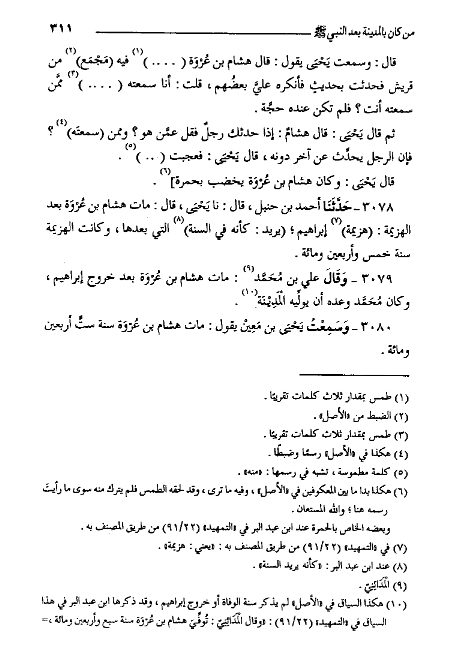٣٠٨٠- وَسَمِعْتُ يَحْيَى بن مَعِيْن يقول: مات هشام بن عُرْوَة سنة ستٍّ أربعين ومئة