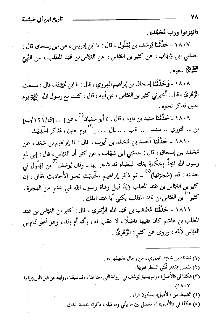 ١٨٠٧- حَدَّثَنا يُوسُف بن بُهْلُول، قال: حدثنا ابْنُ إِدْرِيسَ، عَنِ ابْنِ إِسْحَاقَ قَالَ: حَدَّثَنِي ابْنُ شِهَاب، عَنْ كَثِيرِ بْنِ العَبَّاس، عَنِ العَبَّاس بْنِ عَبْد الْمُطَّلِبِ، عَنِ النَّبِيّ عَلَيْهِ السَّلامُ نَحْوَهُ.