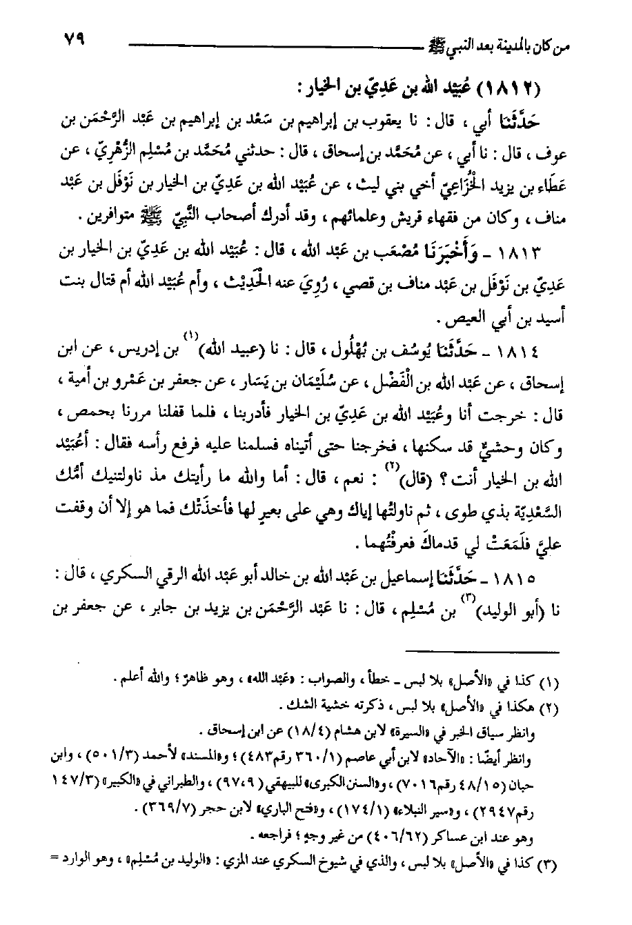 ١٨١٣- وَأَخْبَرَنَا مُصْعَب بْنُ عَبْد اللَّهِ، قَالَ: عُبَيْد الله بن عَدِيّ بن الخيار بْنِ عَدِيّ بْنِ نَوْفَل بْنِ عَبْد مناف بن قصي، رُوِيَ عنه الْحَدِيْث، وأم عُبَيْد الله أم قتال بنت أسيد بن أبي العيص.