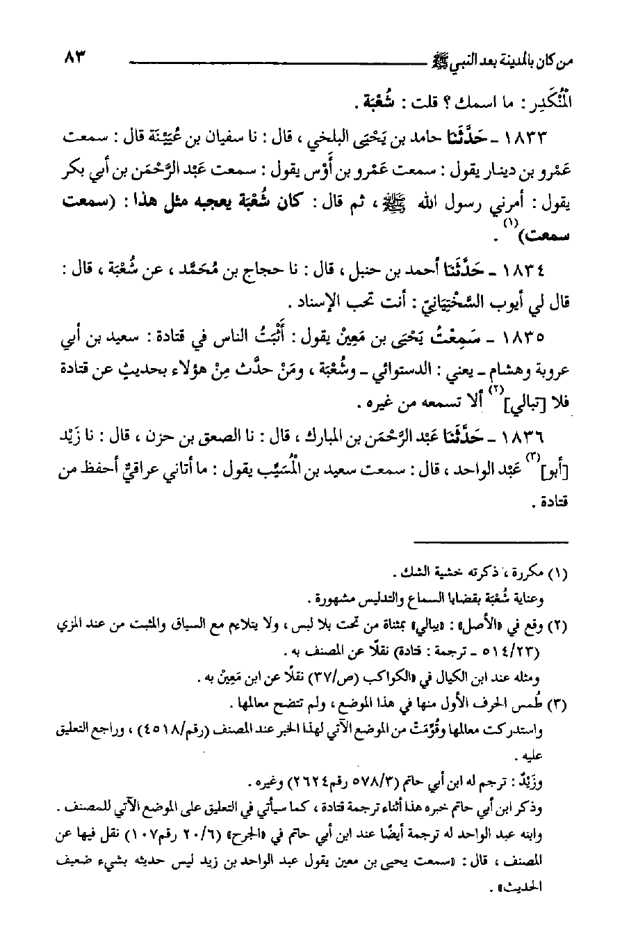 ١٨٣٥- سَمِعْتُ يَحْيَى بْن مَعِيْن يَقُولُ: أَثْبَتُ الناس في قتادة: سعيد بن أبي عروبة وهشام - يعني: الدستوائي - وشُعْبَة، ومَنْ حدَّث مِنْ هؤلاء بحديثٍ عن قتادة فلا تبالي ألا تسمعه من غيره.