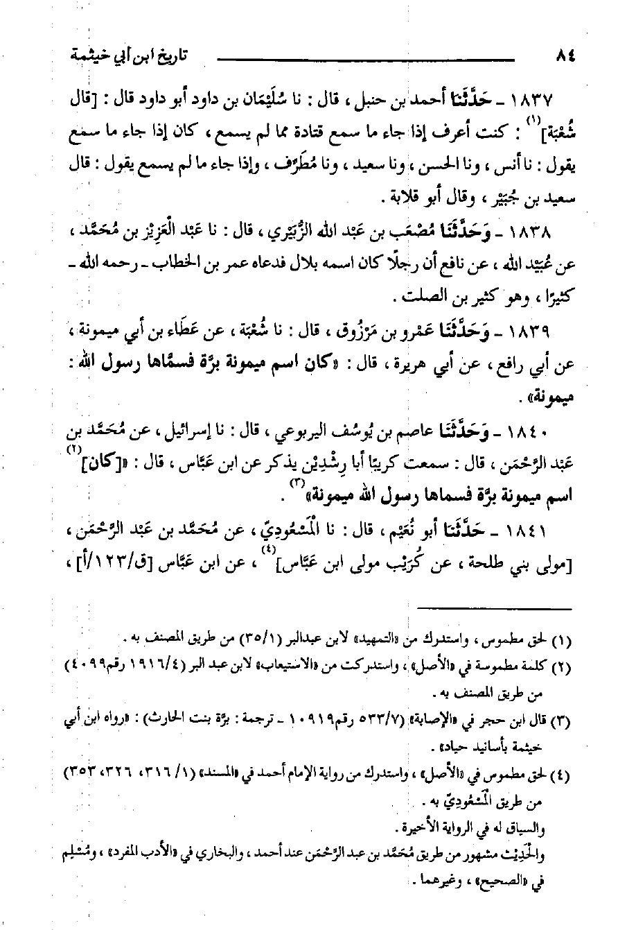 ١٨٤٠- وَحَدَّثَنَا عَاصِمُ بْنُ يُوسُف اليربوعي، قال: حدثنا إِسْرَائِيلُ، عَنْ مُحَمَّد بْنِ عَبْد الرَّحْمَن، قَالَ: سَمِعْتُ كُرَيْبًا أَبَا رِشْدِيْن يَذْكُرُ عَنِ ابْنِ عَبَّاس، قَالَ: كَانَ اسْمُ مَيْمُونَةَ برَّة فَسَمَّاهَا رَسُولُ اللَّهِ مَيْمُونَةُ".
