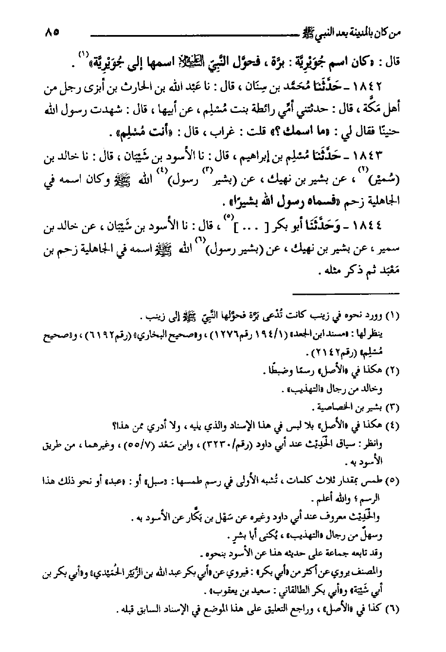 ١٨٤٣- حَدَّثَنا مُسْلِم بْن إِبْرَاهِيمَ، قَالَ: حدثنا الأسود بن شَيْبَان، قال: حدثنا خَالِدُ بْنُ سُميْر، عَنْ بَشِيرِ بْنِ نَهِيكٍ، عَنْ بَشِيرِ رَسُولِ اللَّهِ صَلَّى اللَّهُ عَلَيْهِ وَسَلَّمَ وَكَانَ اسْمَهُ فِي الْجَاهِلِيَّةِ زَحْمٌ "فسماه رسول الله بَشِيرًا.