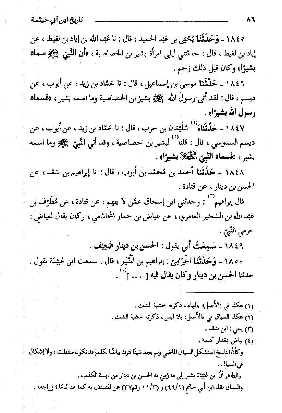 ١٨٤٦- حَدَّثَنا مُوسَى بْنُ إِسْمَاعِيلَ، قال: حدثنا حَمَّاد بْنُ زَيْدٍ، عَنْ أَيُّوبَ، عَنْ دَيْسَمٍ، قَالَ: لَقَدْ أَتَى رسولَ اللَّهِ صَلَّى اللَّهُ عَلَيْهِ وَسَلَّمَ بشيرُ بْنُ الْخَصَاصِيَّةِ وَمَا اسْمُهُ بَشِيرٌ، "فَسَمَّاهُ رَسُولُ اللَّهِ بَشِيرًا.