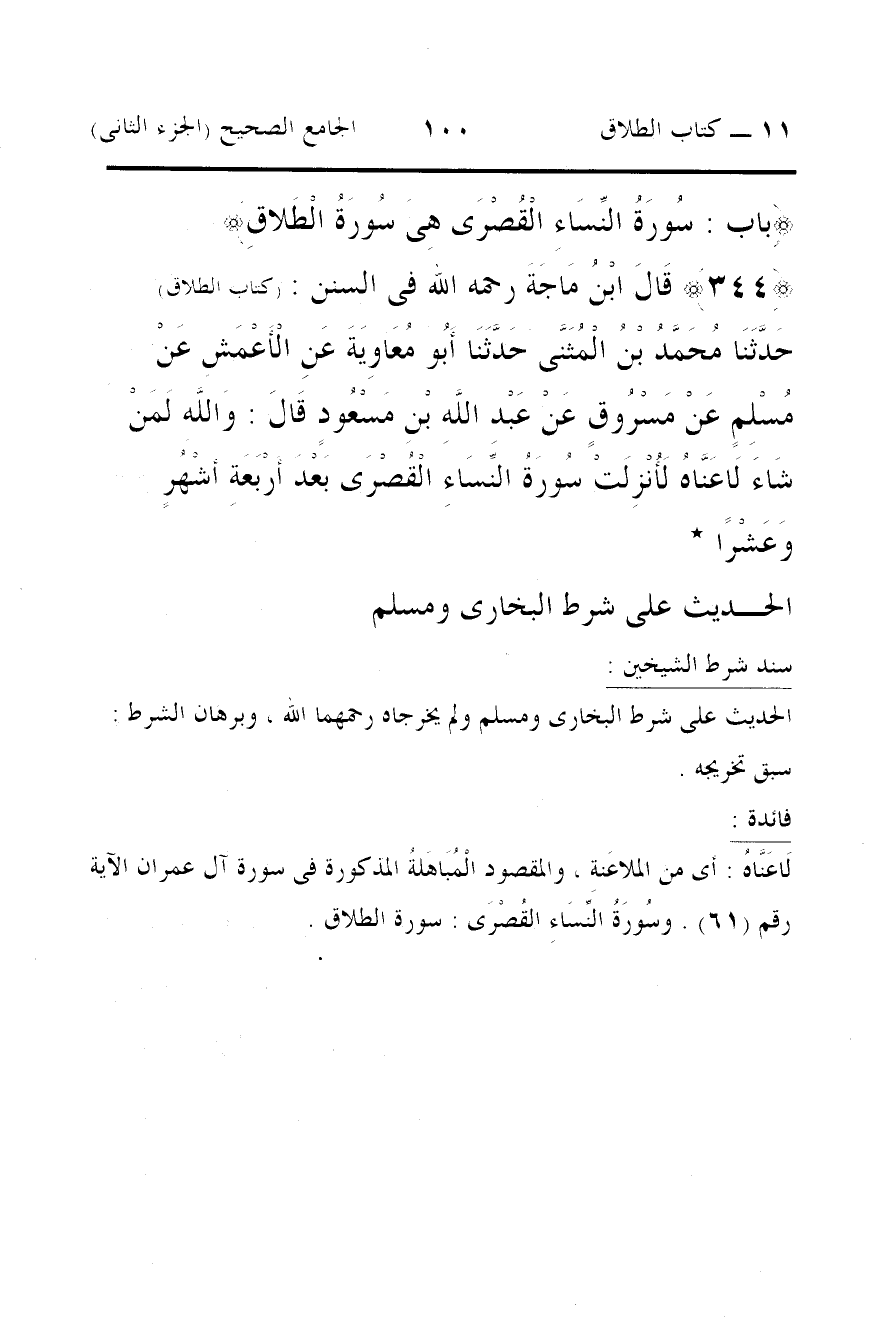 حَدَّثَنَا مُحَمَّدُ بْنُ الْمُثَنَّى حَدَّثَنَا أَبُو مُعَاوِيَةَ عَنِ الْأَعْمَشِ عَنْ مُسْلِمٍ عَنْ مَسْرُوقٍ عَنْ عَبْدِ اللَّهِ بْنِ مَسْعُودٍ قَالَ: وَاللَّهِ لَمَنْ شَاءَ لَاعَنَّاهُ لَأُنْزِلَتْ سُورَةُ النِّسَاءِ الْقُصْرَى بَعْدَ أَرْبَعَةِ أَشْهُرٍ وَعَشْرًا *