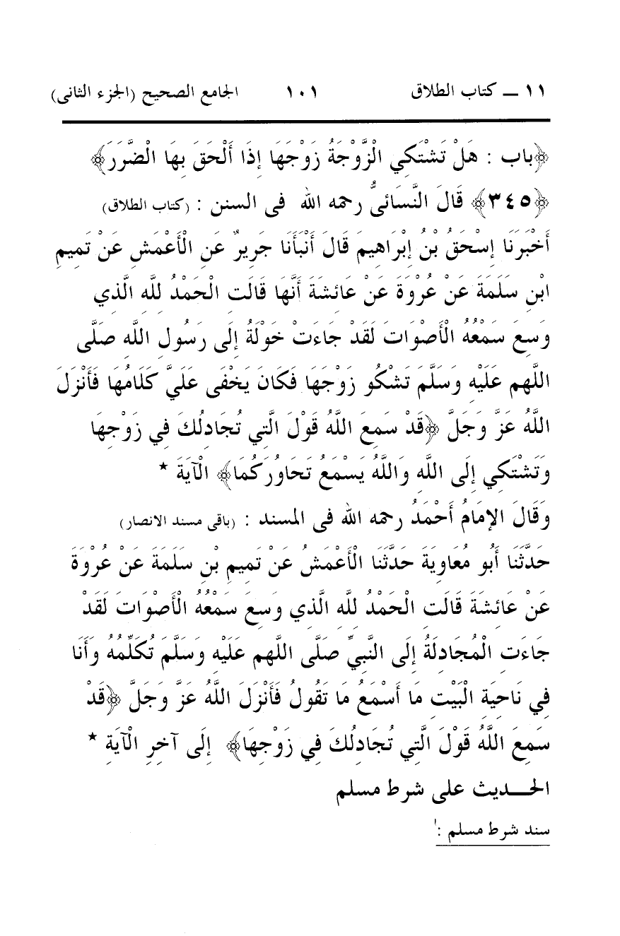 345 - قَالَ النَّسَائىُّ رحمه الله فى السنن: (كتاب الطلاق) أَخْبَرَنَا إِسْحَقُ بْنُ إِبْرَاهِيمَ قَالَ أَنْبَأَنَا جَرِيرٌ عَنِ الْأَعْمَشِ عَنْ تَمِيمِ ابْنِ سَلَمَةَ عَنْ عُرْوَةَ عَنْ عَائِشَةَ أَنَّهَا قَالَتِ الْحَمْدُ لِلَّهِ الَّذِي وَسِعَ سَمْعُهُ الْأَصْوَاتَ لَقَدْ جَاءَتْ خَوْلَةُ إِلَى رَسُولِ اللَّهِ صَلَّى اللَّهم عَلَيْهِ وَسَلَّمَ تَشْكُو زَوْجَهَا فَكَانَ يَخْفَى عَلَيَّ كَلَامُهَا فَأَنْزَلَ اللَّهُ عَزَّ وَجَلَّ {قَدْ سَمِعَ اللَّهُ قَوْلَ الَّتِي تُجَادِلُكَ فِي زَوْجِهَا وَتَشْتَكِي إِلَى اللَّهِ وَاللَّهُ يَسْمَعُ تَحَاوُرَكُمَا} الْآيَةَ *