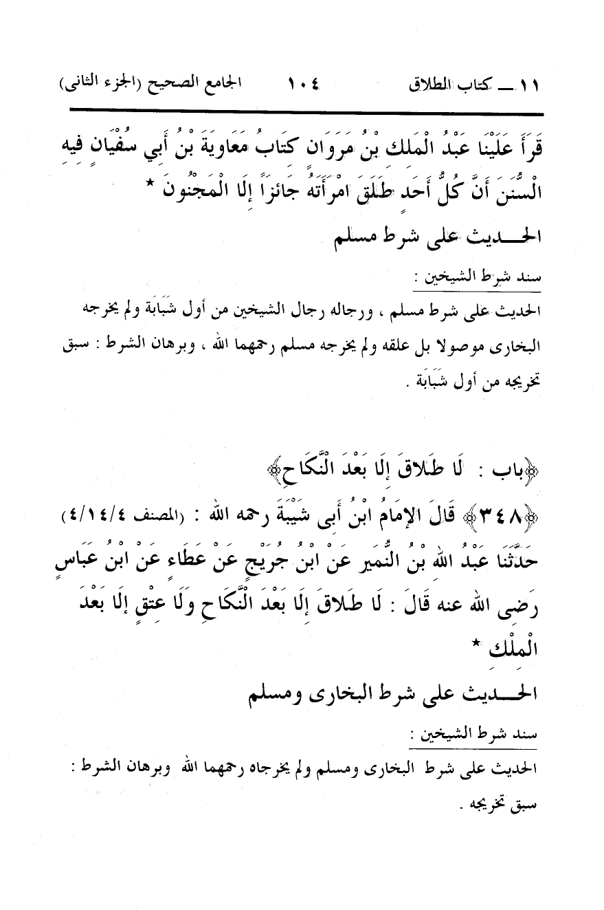 حَدَّثَنَا عَبْدُ اللهِ بْنُ النُّمَير عَنْ ابْنُ جُرَيْجٍ عَنْ عَطَاءٍ عَنْ ابْنُ عَبَاسٍ رَضِى الله عنه قَالَ: لَا طَلاقَ إِلَا بَعْدَ الْنَّكَاحِ وَلَا عِتْقٍ إلَا بَعْدَ الْمِلْكِ *