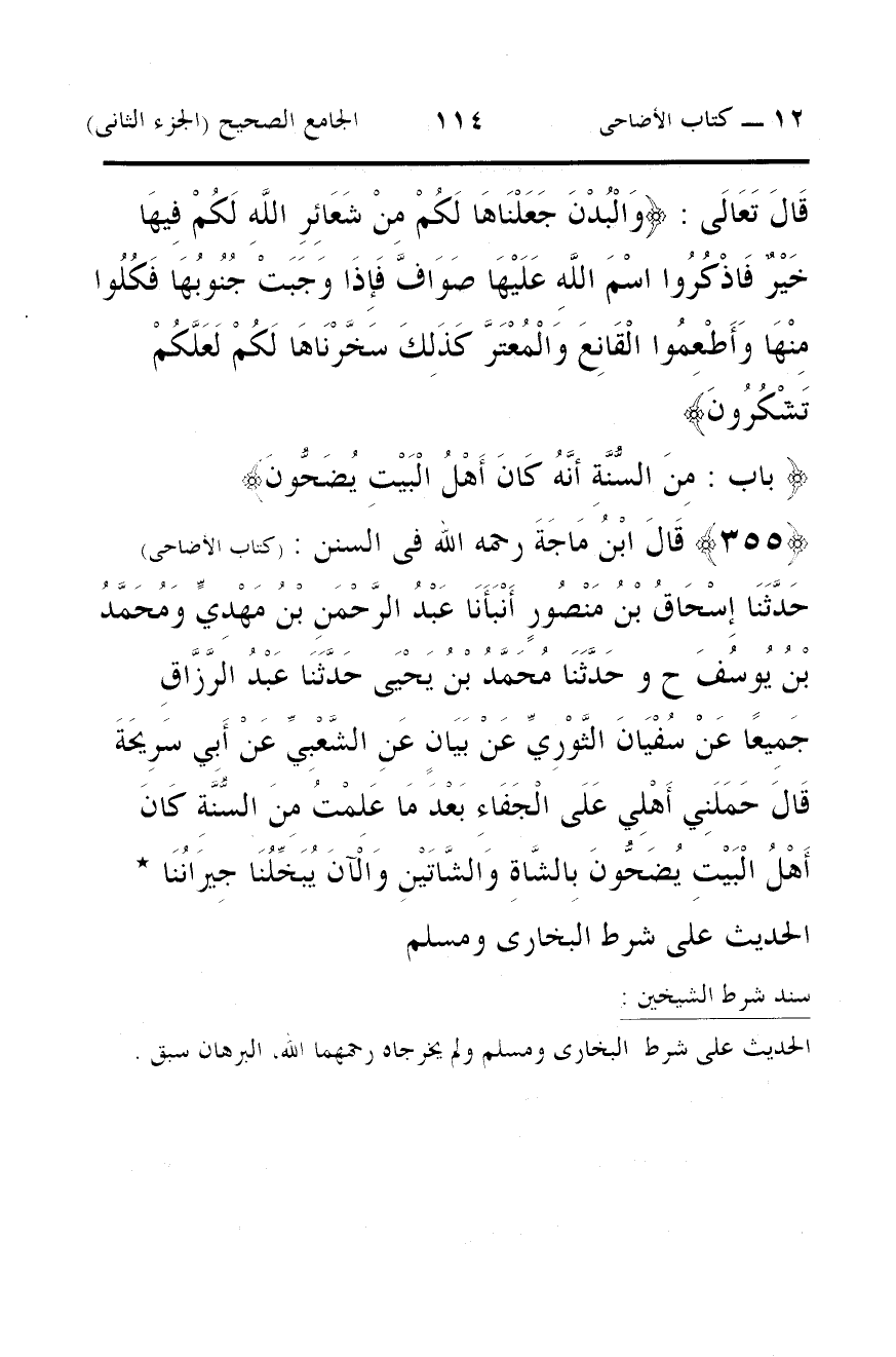 355 - قَالَ ابْنُ مَاجَةَ رحمه الله فى السنن: (كتاب الأضاحى) حَدَّثَنَا إِسْحَاقُ بْنُ مَنْصُورٍ أَنْبَأَنَا عَبْدُ الرَّحْمَنِ بْنُ مَهْدِيٍّ وَمُحَمَّدُ بْنُ يُوسُفَ ح وحَدَّثَنَا مُحَمَّدُ بْنُ يَحْيَى حَدَّثَنَا عَبْدُ الرَّزَّاقِ جَمِيعًا عَنْ سُفْيَانَ الثَّوْرِيِّ عَنْ بَيَانٍ عَنِ الشَّعْبِيِّ عَنْ أَبِي سَرِيحَةَ قَالَ حَمَلَنِي أَهْلِي عَلَى الْجَفَاءِ بَعْدَ مَا عَلِمْتُ مِنَ السُّنَّةِ كَانَ أَهْلُ الْبَيْتِ يُضَحُّونَ بِالشَّاةِ وَالشَّاتَيْنِ وَالْآنَ يُبَخِّلُنَا جِيرَانُنَا *