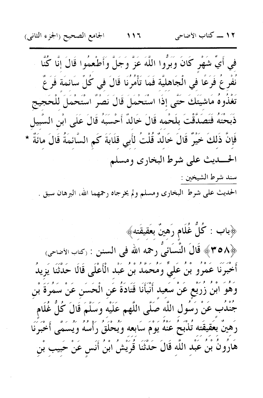 358 - قَالَ النَّسَائىُّ رحمه الله فى السنن: (كتاب الأضاحى) أَخْبَرَنَا عَمْرُو بْنُ عَلِيٍّ وَمُحَمَّدُ بْنُ عَبْدِ الْأَعْلَى قَالَا حَدَّثَنَا يَزِيدُ وَهُوَ ابْنُ زُرَيْعٍ عَنْ سَعِيدٍ أَنْبَأَنَا قَتَادَةُ عَنِ الْحَسَنِ عَنْ سَمُرَةَ بْنِ جُنْدُبٍ عَنْ رَسُولِ اللَّهِ صَلَّى اللَّهم عَلَيْهِ وَسَلَّمَ قَالَ كُلُّ غُلَامٍ رَهِينٌ بِعَقِيقَتِهِ تُذْبَحُ عَنْهُ يَوْمَ سَابِعِهِ وَيُحْلَقُ رَاسُهُ وَيُسَمَّى أَخْبَرَنَا هَارُونُ بْنُ عَبْدِ اللَّهِ قَالَ حَدَّثَنَا قُرَيْشُ ابْنُ أَنَسٍ عَنْ حَبِيبِ بْنِ