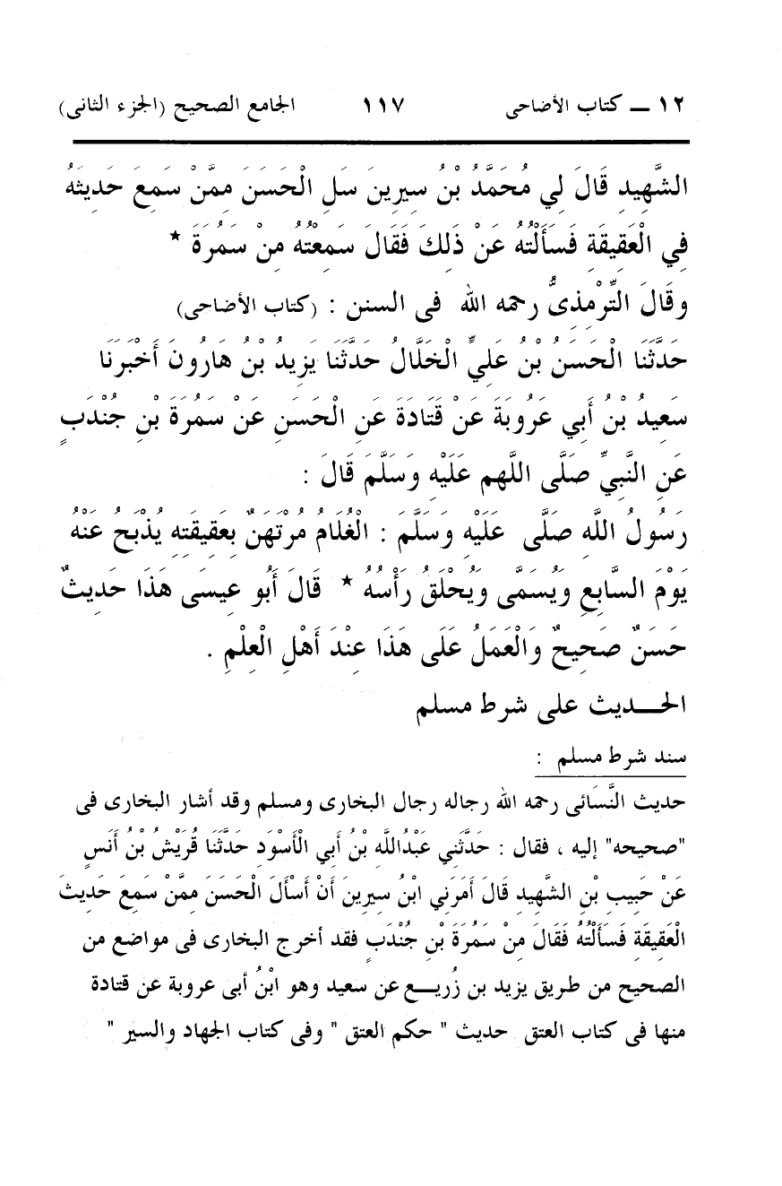 الشَّهِيدِ قَالَ لِي مُحَمَّدُ بْنُ سِيرِينَ سَلِ الْحَسَنَ مِمَّنْ سَمِعَ حَدِيثَهُ فِي الْعَقِيقَةِ فَسَأَلْتُهُ عَنْ ذَلِكَ فَقَالَ سَمِعْتُهُ مِنْ سَمُرَةَ *