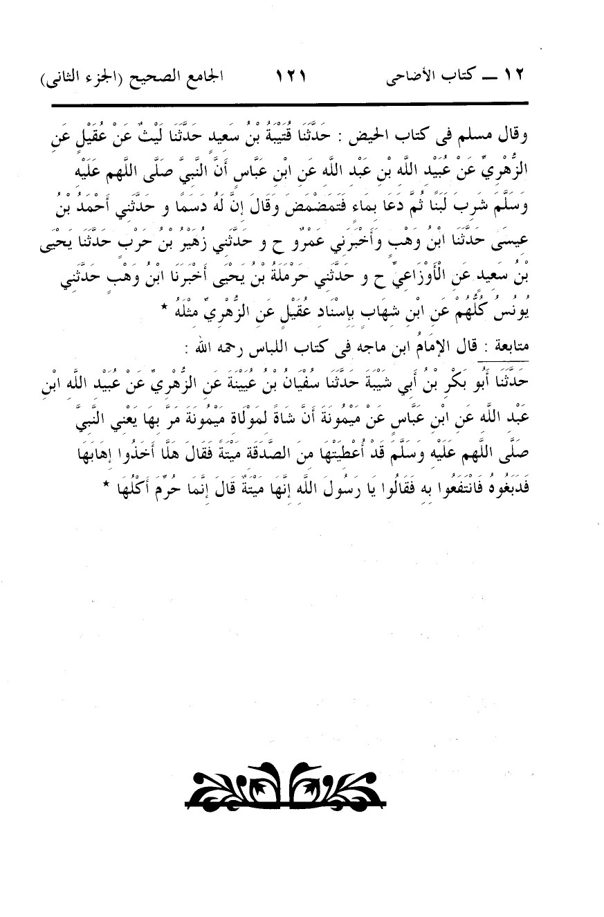 وقال مسلم فى كتاب الحيض: حَدَّثَنَا قُتَيْبَةُ بْنُ سَعِيدٍ حَدَّثَنَا لَيْثٌ عَنْ عُقَيْلٍ عَنِ الزُّهْرِيِّ عَنْ عُبَيْدِ اللَّهِ بْنِ عَبْدِ اللَّهِ عَنِ ابْنِ عَبَّاسٍ أَنَّ النَّبِيَّ صَلَّى اللَّهم عَلَيْهِ وَسَلَّمَ شَرِبَ لَبَنًا ثُمَّ دَعَا بِمَاءٍ فَتَمَضْمَضَ وَقَالَ إِنَّ لَهُ دَسَمًا وحَدَّثَنِي أَحْمَدُ بْنُ عِيسَى حَدَّثَنَا ابْنُ وَهْبٍ وَأَخْبَرَنِي عَمْرٌو ح وحَدَّثَنِي زُهَيْرُ بْنُ حَرْبٍ حَدَّثَنَا يَحْيَى بْنُ سَعِيدٍ عَنِ الْأَوْزَاعِيِّ ح وحَدَّثَنِي حَرْمَلَةُ بْنُ يَحْيَى أَخْبَرَنَا ابْنُ وَهْبٍ حَدَّثَنِي يُونُسُ كُلُّهُمْ عَنِ ابْنِ شِهَابٍ بِإِسْنَادِ عُقَيْلٍ عَنِ الزُّهْرِيِّ مِثْلَهُ *
