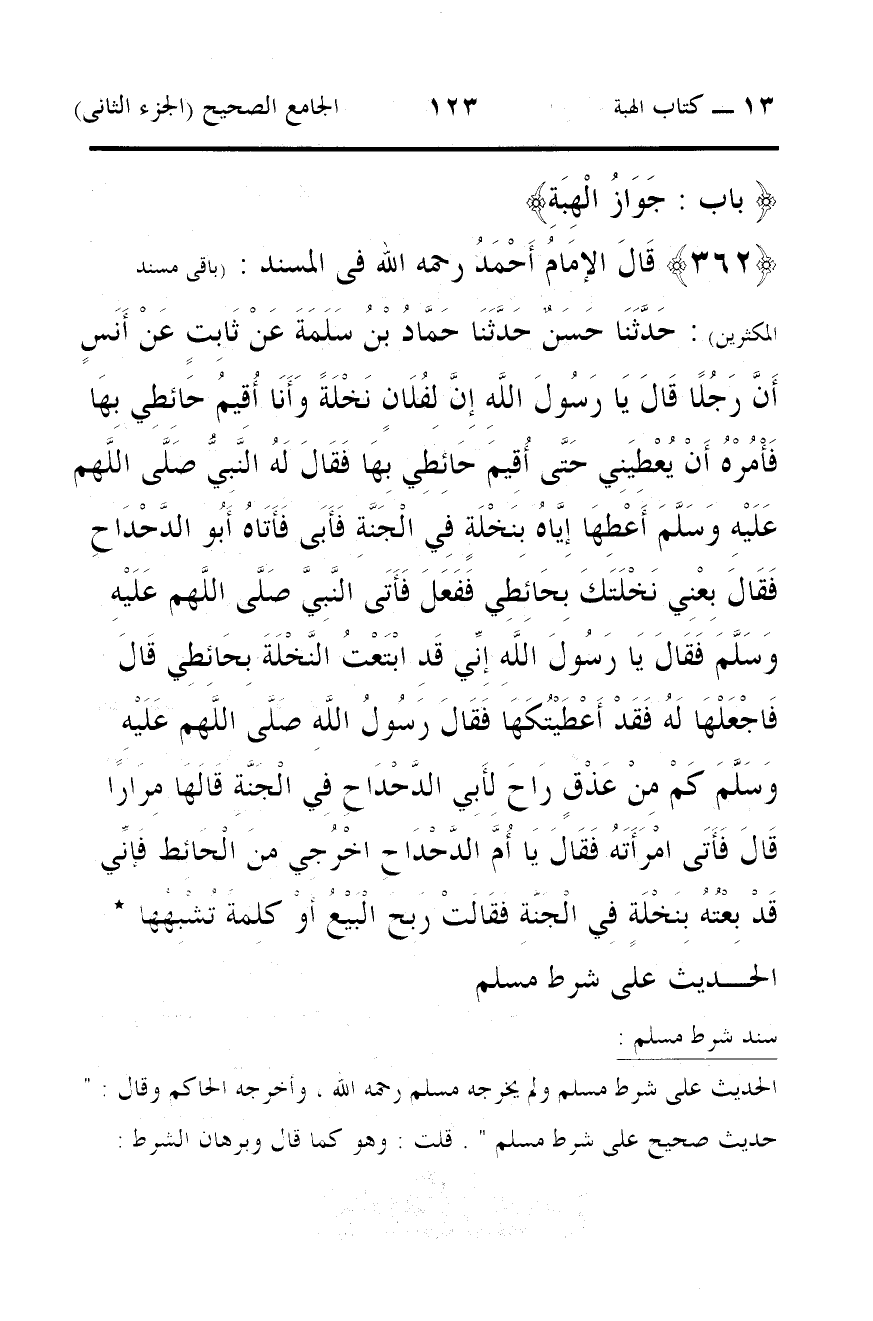 362 - قَالَ الإمَامُ أَحْمَدُ رحمه الله فى المسند: (باقى مسند المكثرين): حَدَّثَنَا حَسَنٌ حَدَّثَنَا حَمَّادُ بْنُ سَلَمَةَ عَنْ ثَابِتٍ عَنْ أَنَسٍ أَنَّ رَجُلًا قَالَ يَا رَسُولَ اللَّهِ إِنَّ لِفُلَانٍ نَخْلَةً وَأَنَا أُقِيمُ حَائِطِي بِهَا فَامُرْهُ أَنْ يُعْطِيَنِي حَتَّى أُقِيمَ حَائِطِي بِهَا فَقَالَ لَهُ النَّبِيُّ صَلَّى اللَّهم عَلَيْهِ وَسَلَّمَ أَعْطِهَا إِيَّاهُ بِنَخْلَةٍ فِي الْجَنَّةِ فَأَبَى فَأَتَاهُ أَبُو الدَّحْدَاحِ فَقَالَ بِعْنِي نَخْلَتَكَ بِحَائِطِي فَفَعَلَ فَأَتَى النَّبِيَّ صَلَّى اللَّهم عَلَيْهِ وَسَلَّمَ فَقَالَ يَا رَسُولَ اللَّهِ إِنِّي قَدِ ابْتَعْتُ النَّخْلَةَ بِحَائِطِي قَالَ فَاجْعَلْهَا لَهُ فَقَدْ أَعْطَيْتُكَهَا فَقَالَ رَسُولُ اللَّهِ صَلَّى اللَّهم عَلَيْهِ وَسَلَّمَ كَمْ مِنْ عَذْقٍ رَاحَ لِأَبِي الدَّحْدَاحِ فِي الْجَنَّةِ قَالَهَا مِرَارًا قَالَ فَأَتَى امْرَأَتَهُ فَقَالَ يَا أُمَّ الدَّحْدَاحِ اخْرُجِي مِنَ الْحَائِطِ فَإِنِّي قَدْ بِعْتُهُ بِنَخْلَةٍ فِي الْجَنَّةِ فَقَالَتْ رَبِحَ الْبَيْعُ أَوْ كَلِمَةً تُشْبِهُهَا *