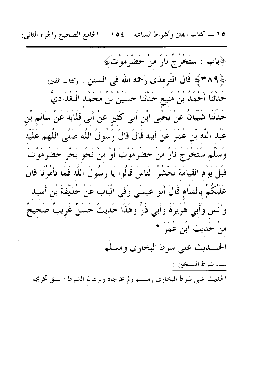 حَدَّثَنَا شَيْبَانُ عَنْ يَحْيَى ابْنِ أَبِي كَثِيرٍ عَنْ أَبِي قِلَابَةَ عَنْ سَالِمِ بْنِ عَبْدِ اللَّهِ بْنِ عُمَرَ عَنْ أَبِيهِ قَالَ قَالَ رَسُولُ اللَّهِ صَلَّى اللَّهم عَلَيْهِ وَسَلَّمَ سَتَخْرُجُ نَارٌ مِنْ حَضْرَمَوْتَ أَوْ مِنْ نَحْوِ بَحْرِ حَضْرَمَوْتَ قَبْلَ يَوْمِ الْقِيَامَةِ تَحْشُرُ النَّاسَ قَالُوا يَا رَسُولَ اللَّهِ فَمَا تَامُرُنَا قَالَ عَلَيْكُمْ بِالشَّامِ قَالَ أَبو عِيسَى وَفِي الْبَاب عَنْ حُذَيْفَةَ بْنِ أَسِيدٍ وَأَنَسٍ وَأَبِي هُرَيْرَةَ وَأَبِي ذَرٍّ وَهَذَا حَدِيثٌ حَسَنٌ غَرِيبٌ صَحِيحٌ مِنْ حَدِيثِ ابْنِ عُمَرَ *
